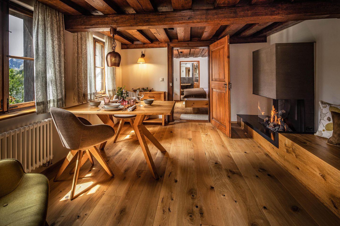 Direkt angrenzend an die Küche befindet sich das schöne Esszimmer mit Blick über Berchtesgaden. Es ist mit einem großen Esstisch, einem modernen Kamin und einem Lesesessel ausgestattet.