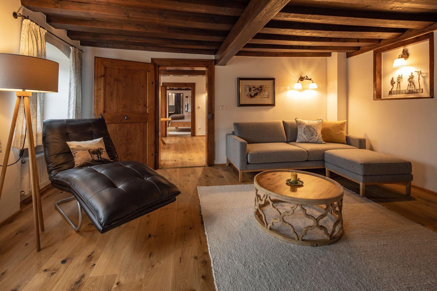Im Wohnzimmer mit großem Flachbild-TV lädt die Lodencouch und eine Relaxliege zum gemütlichen Fernsehen oder Lesen nach einem erlebnisreichen Tag in Berchtesgaden ein. Das Zusammenspiel aus historischen Bauteilen wie der Holztramdecke, den alten Füllungstüren und dem modernen Einrichtungsstil schafft eine ganz besondere Atmosphäre und ein einmaliges Wohngefühl.