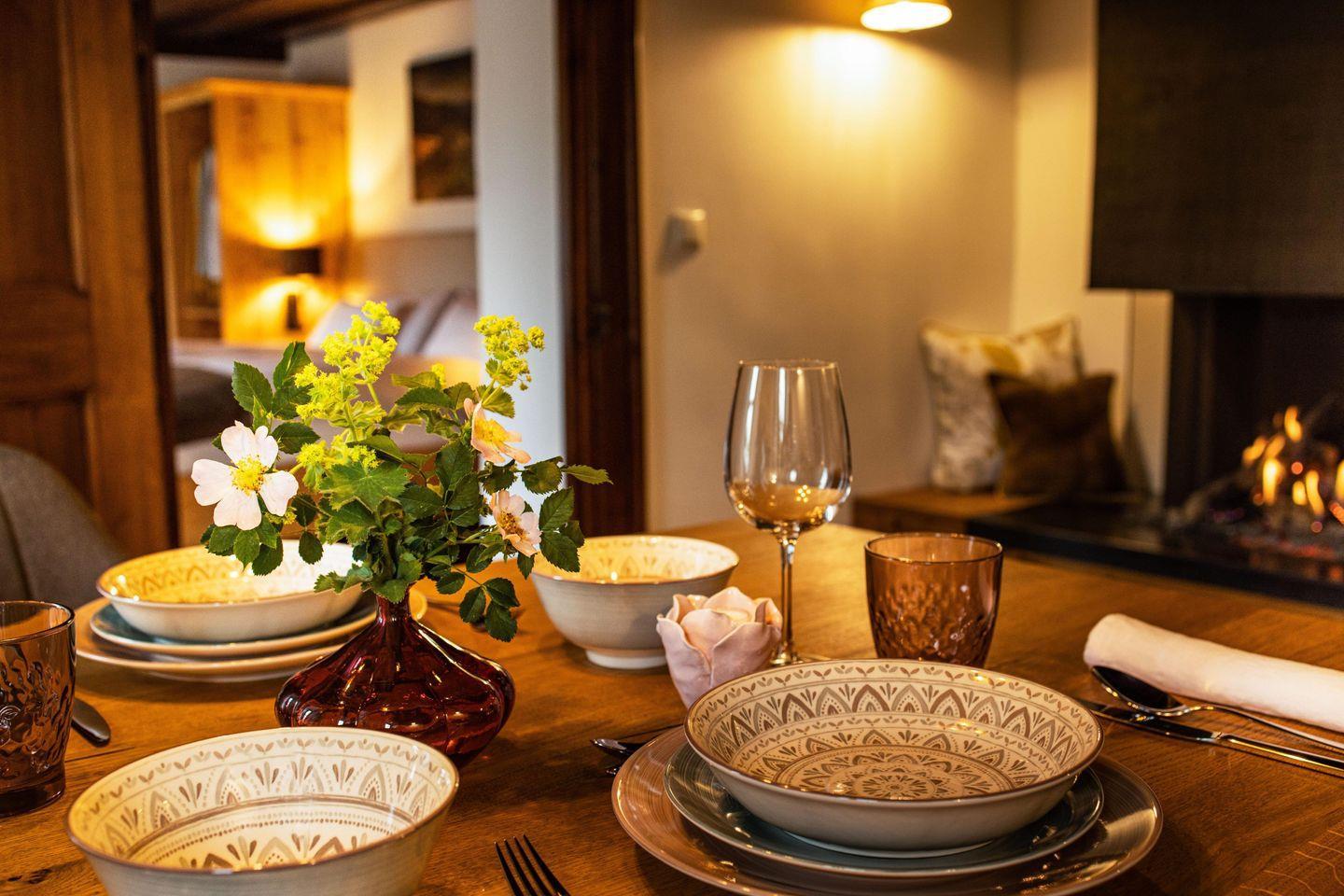 Direkt angrenzend an die Küche befindet sich das schöne Esszimmer mit Blick über Berchtesgaden. Es ist mit einem großen Esstisch, einem modernen Kamin und einem Lesesessel ausgestattet.