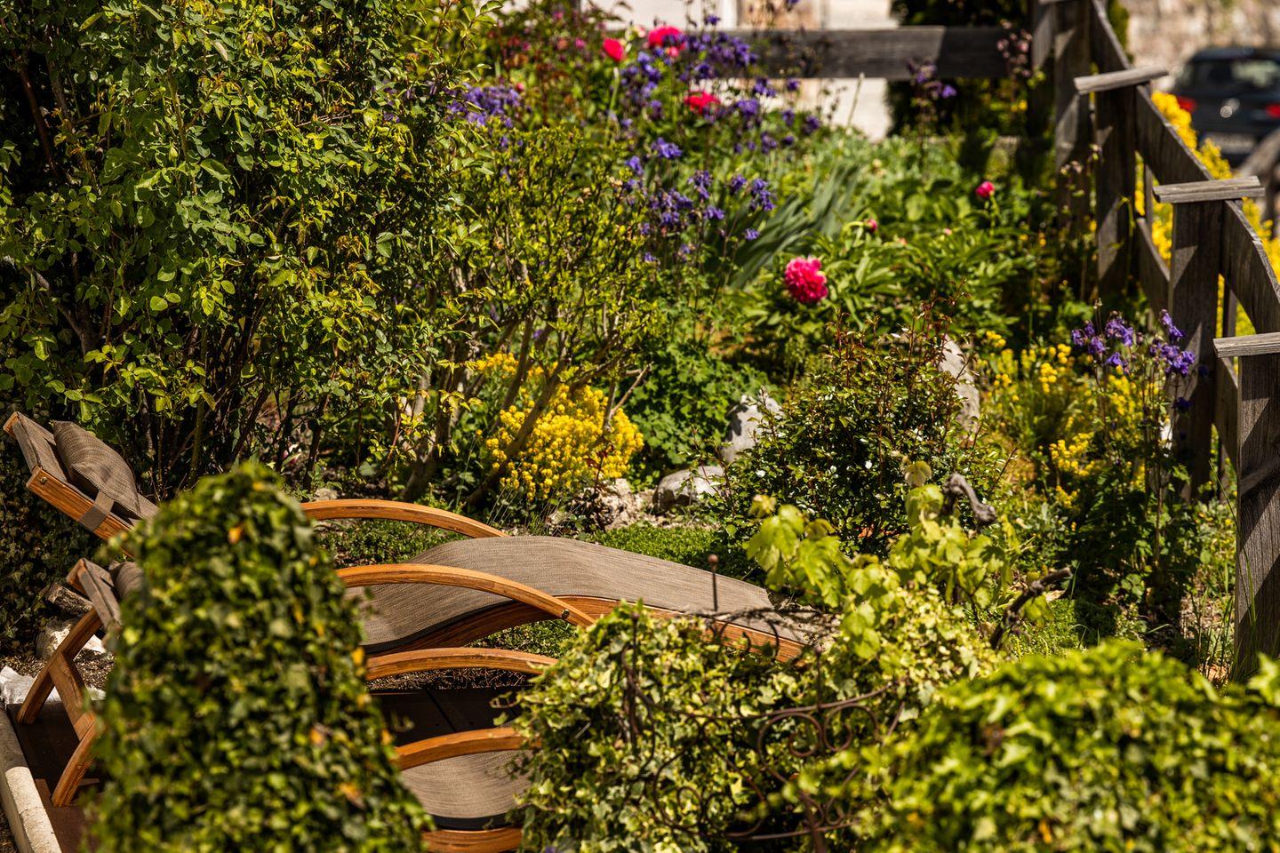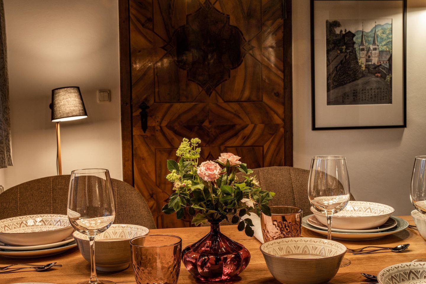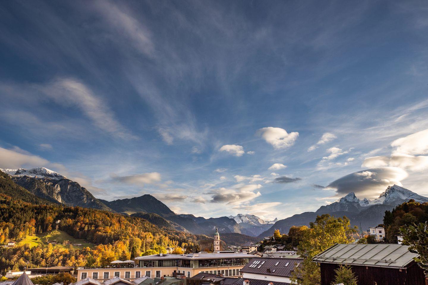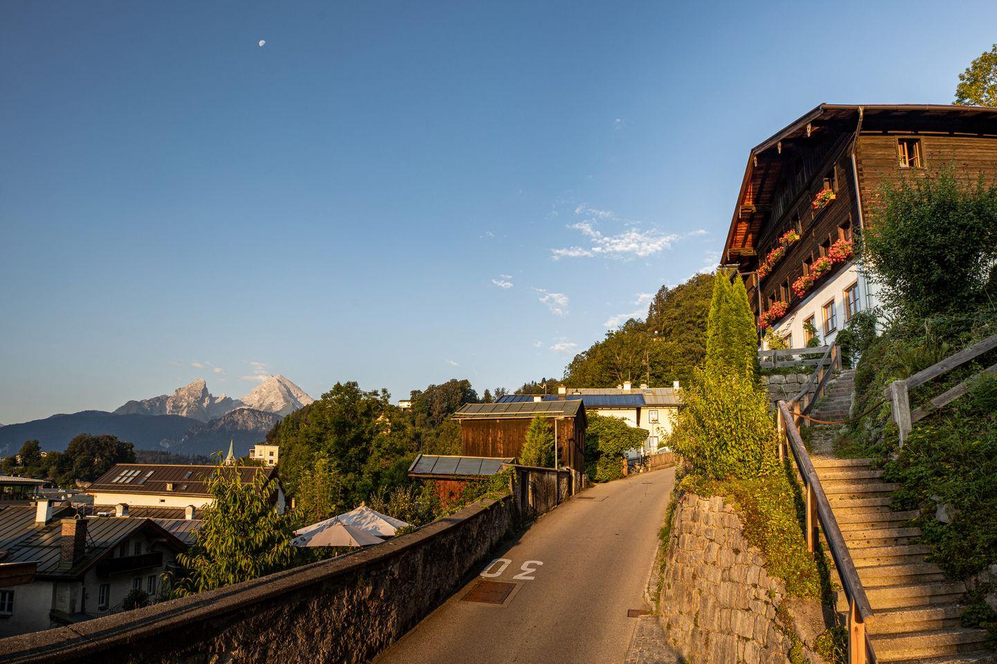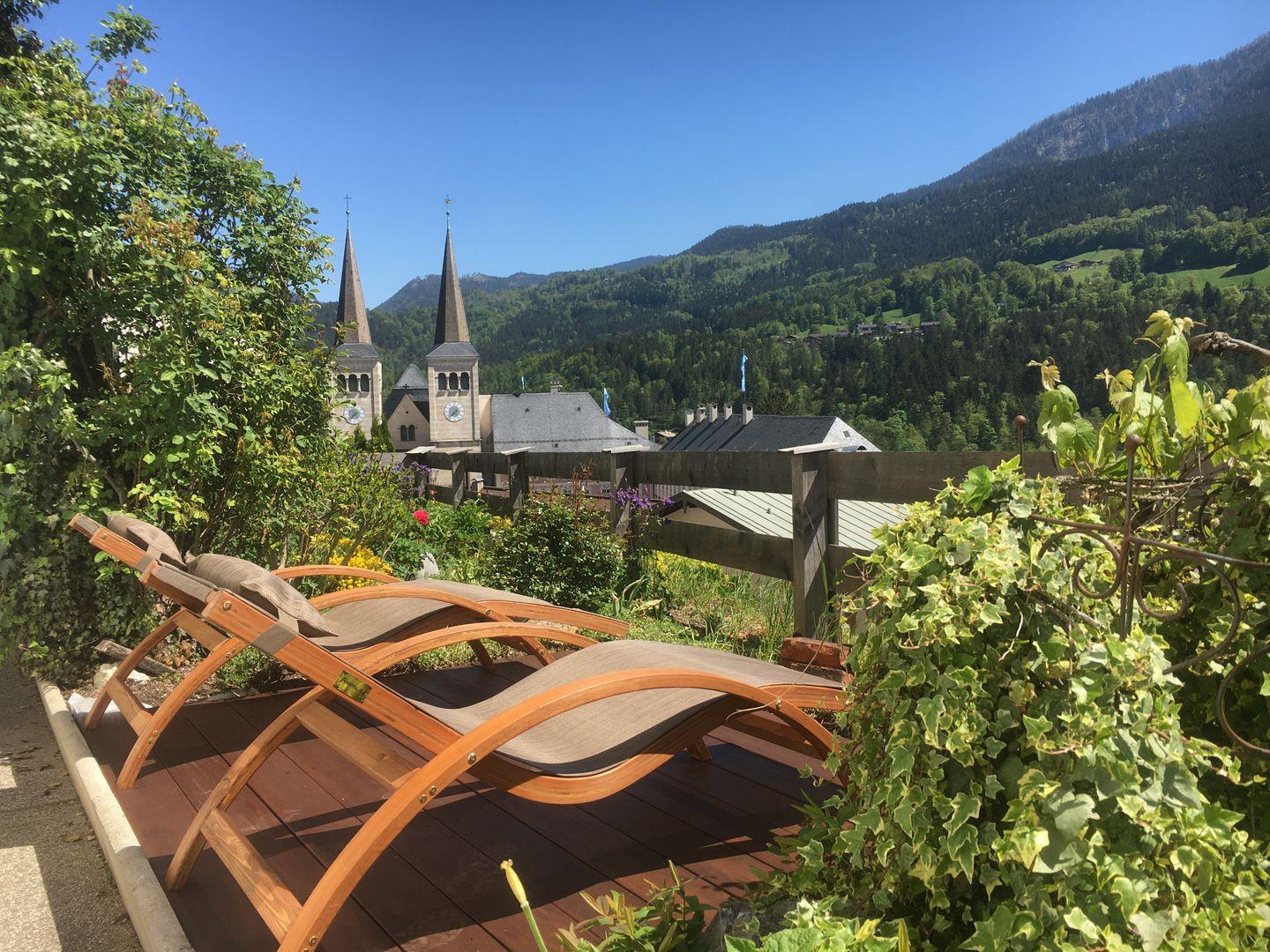 Absolute Highlights dieser Wohnung sind die westseitige überdachte Terrasse und der private Garten mit Sonnenliegen auf der Südseite des Hofmusikerhauses. Beide stehen ausschließlich den Mietern dieser Wohnung zur Verfügung und bieten einen wunderbaren Blick auf den Markt Berchtesgaden und die umliegende Bergwelt. Vom Kehlsteinhaus über die Jenner-Spitze zum Steinernen Meer und den berühmten Watzmann ist alles zu sehen. Genießen Sie ein Frühstück in der Morgensonne, der Bäcker für frische Brötchen ist in wenigen Minuten zu Fuß zu erreichen.