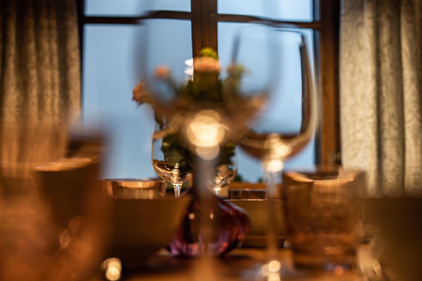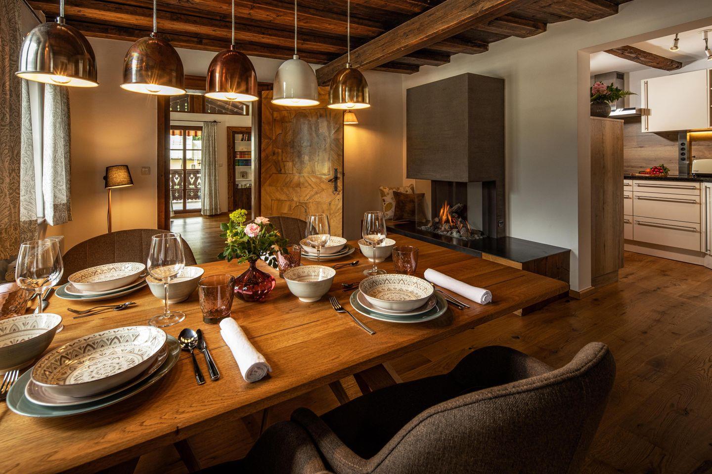 Direkt angrenzend an die Küche befindet sich das schöne Esszimmer mit herrlichem Blick über Berchtesgaden. Es ist mit einem großen Esstisch und einem modernen Kamin sowie einer Relaxliege ausgestattet.