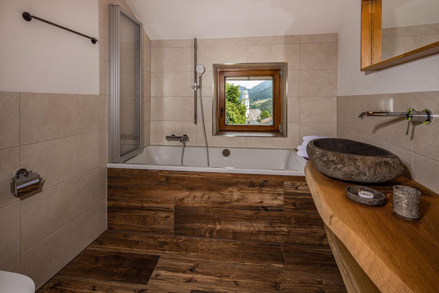 Im gemütlichen Dachgeschoss befindet sich ein offener Lounge-Bereich mit einer einladenden Lodencouch und einem großem Flachbild-TV, sowie ein weiteres Schlafzimmer mit getrennten Betten und einem Schreibtisch. Sie können diesen Raum also auch als Arbeitszimmer nutzen. Ebenfalls im Dachgeschoss befindet sich ein weiteres Badezimmer mit Badewanne und großartigem Blick auf das Wittelsbacher Schloss von Berchtesgaden und die Türme der Stiftskirche. Wir weisen auf die reduzierte Raumhöhe in diesem Geschoß hin.