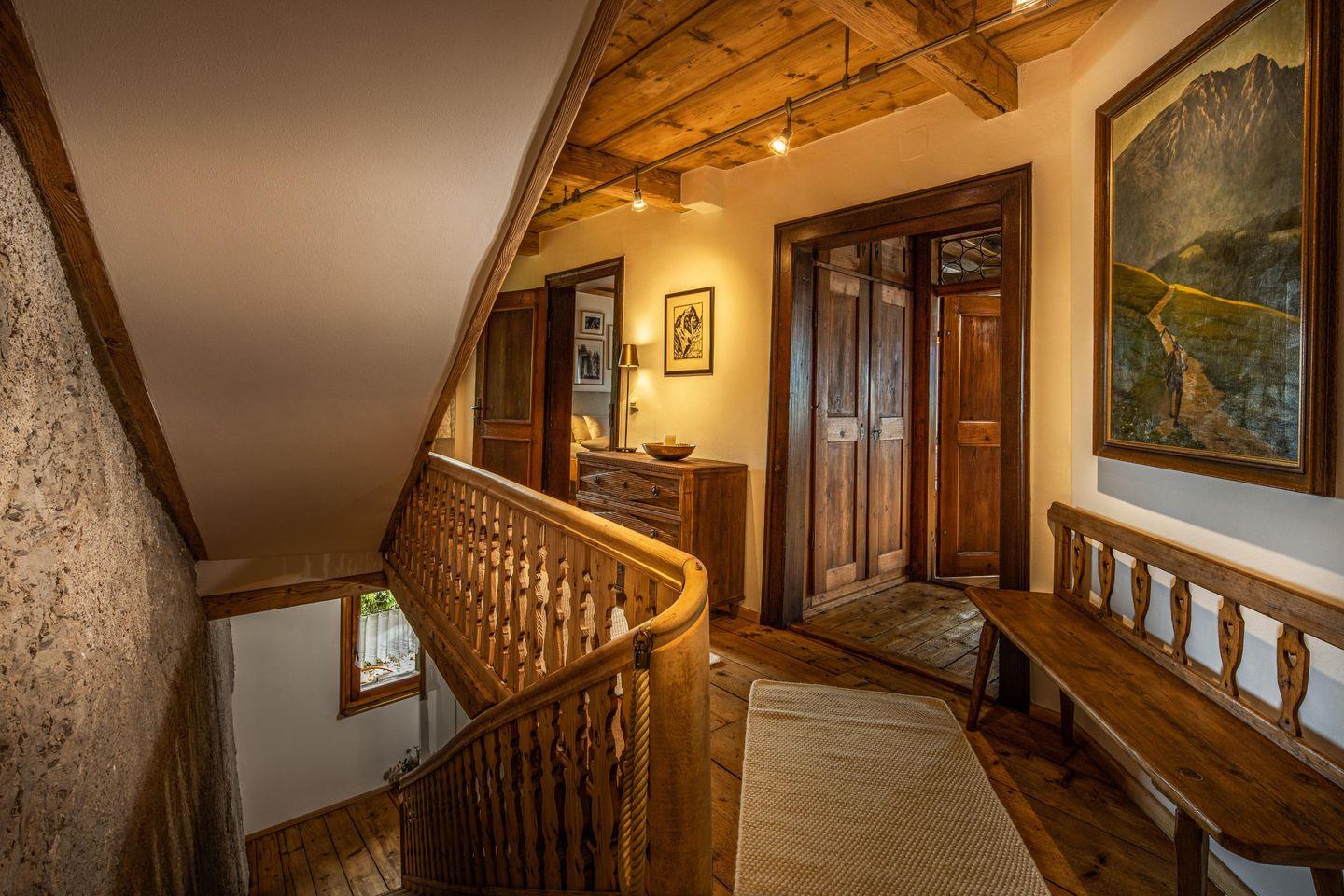 Geschlafen wird in einem für seine besonderen Schlafeigenschaften bekannten Zirbenholz-Schlafzimmer. Das gemütliche Doppelbett mit Lodenkopfteil und Premium-Matratzen sorgen für erholsame Nächte. Ein Flachbild-TV ist ebenso vorhanden wie Verdunkelungsvorhänge um ungestört ausschlafen zu können.