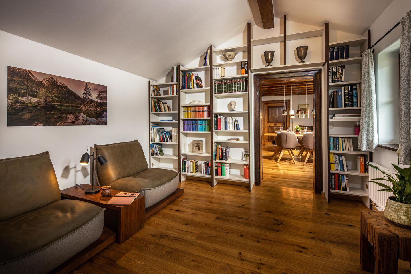 Eine gut sortierte Bibliothek mit bequemer Leder-Sitzgarnitur lädt dazu ein nach einem erlebnisreichen Tag in Berchtesgaden den Tag gemütlich ausklingen zu lassen.