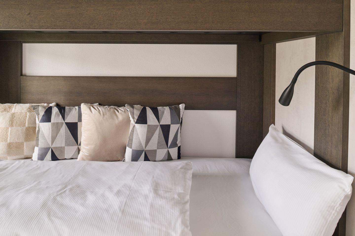 Es stehen zwei Schlafzimmer zur Verfügung: eines mit einem komfortablen Doppelbett und ein weiteres mit einem Stockbett, dessen untere Liegefläche mit 1,20?m Breite auch ideal für Erwachsene geeignet ist.