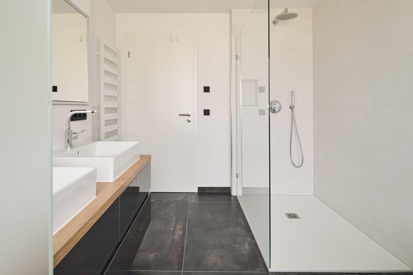 Das Badezimmer mit bodengleicher Dusche und einer Eckbadewanne wird ergänzt durch ein separates Gäste-WC.