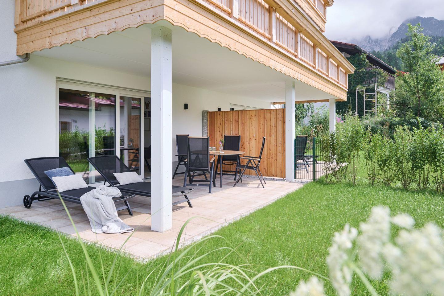 Die überdachte Terrasse und der private angrenzende Gartenbereich mit Blick nach Berchtesgaden und auf den Untersberg laden zum Sonnenbaden und Entspannen ein. Vom seitlichen Gartenbereich können Sie bei sogar einen Blick auf den Watzmann erhaschen.