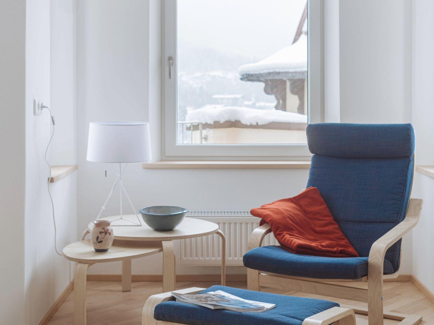 Das Herzstück der Wohnung ist der lichtdurchflutete Wohn- und Essbereich mit Erker. Von hier aus öffnet sich der Blick auf die Berchtesgadener Bergwelt mit dem Watzmann, dem Kehlsteinhaus, dem Hohen Brett und dem Jenner. Ob am Esstisch, auf dem Sofa oder im Relax-Sessel – der Ausblick begleitet Sie durch den ganzen Tag.