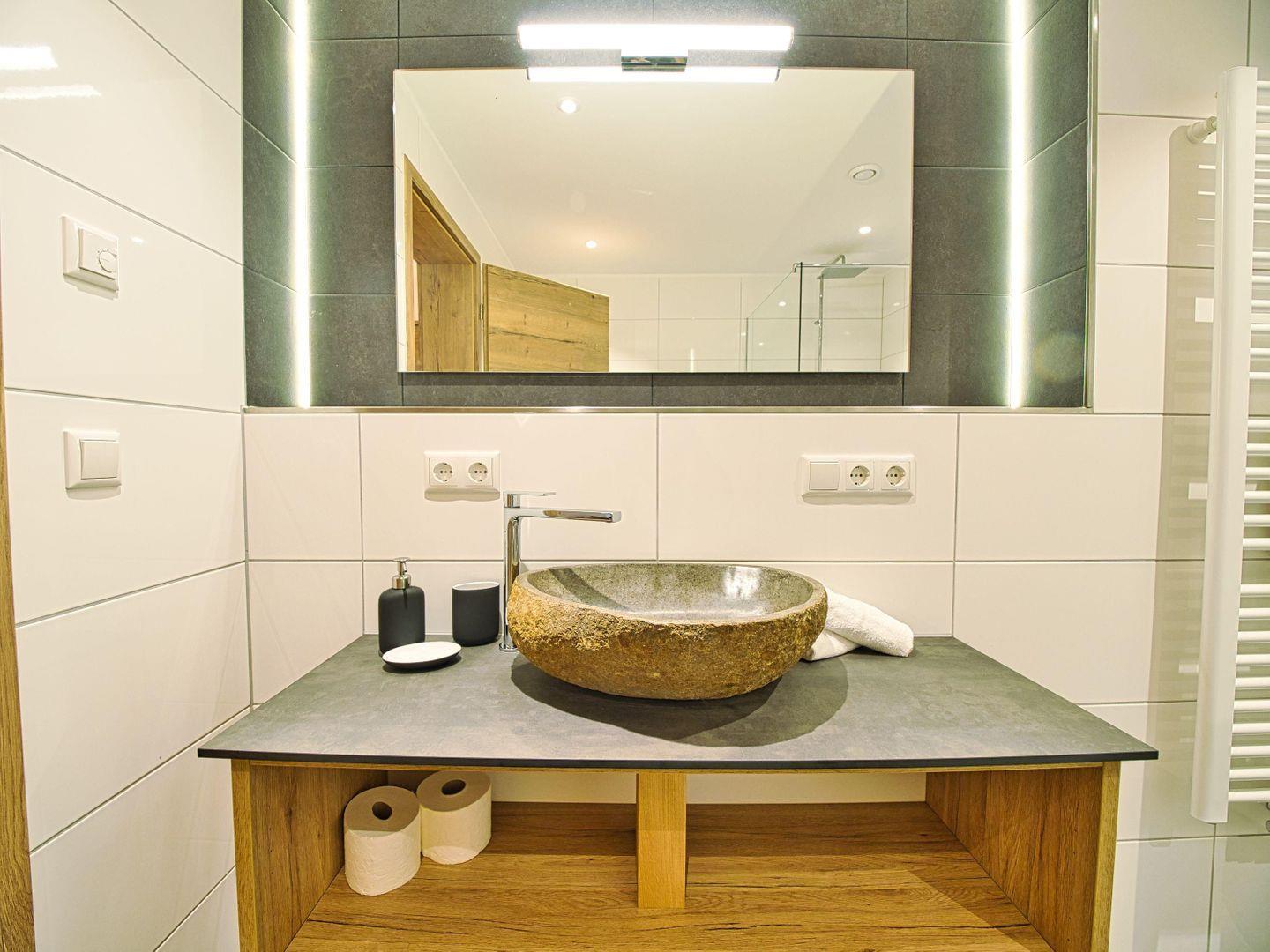 Im stilvollen Badezimmer genießen Sie Wellness pur unter der großzügigen Regendusche, während die Fußbodenheizung für behagliche Wärme sorgt.