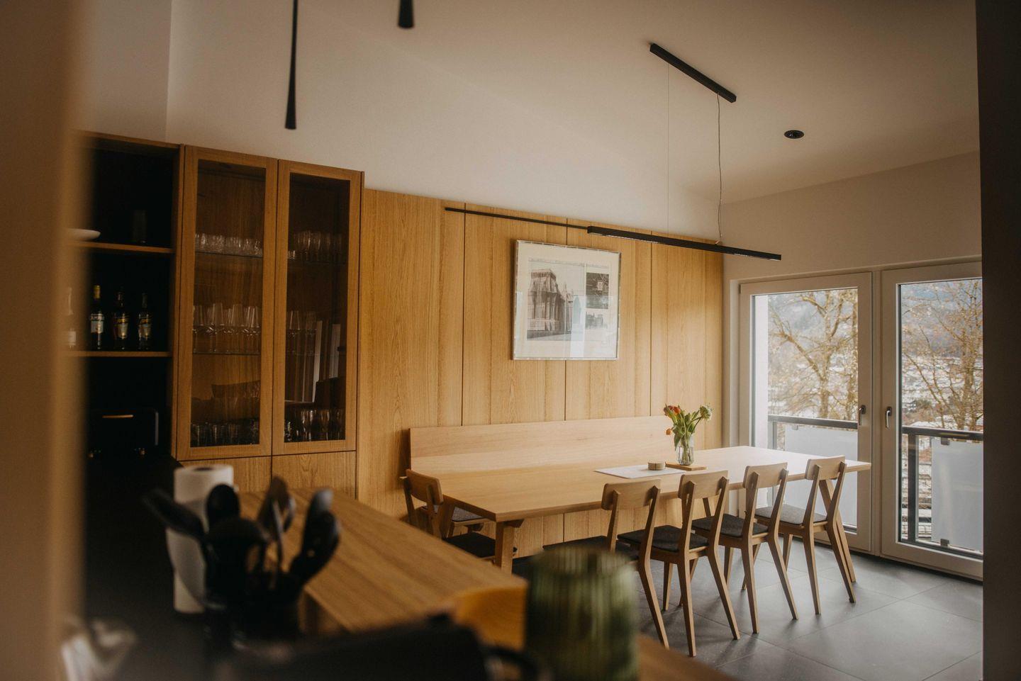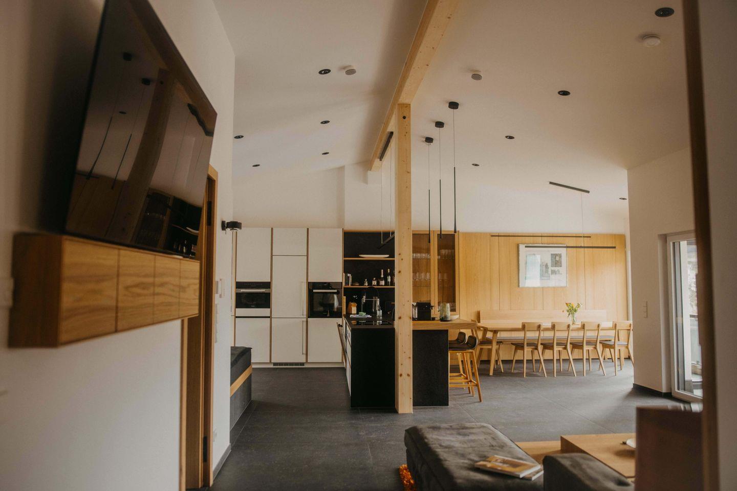 Unser Penthouse liegt im zweiten Stock eines hochwertigen Neubaus und ist barrierearm über den Aufzug erreichbar. Bodentiefe Fenster öffnen den Blick auf die Berge. Hohe Decken, sichtbare Holzelemente und ein stimmiges Lichtkonzept schaffen ein offenes Raumgefühl im Stil eines modernen Chalets. Im Inneren bleiben die Räume wohltuend ruhig, die Raumluft wird automatisch erneuert, auch bei geschlossenen Fensterfronten.