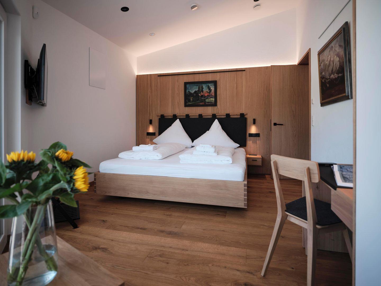 Drei Schlafzimmer, zwei Bäder, eine private Sauna und eine maßgefertigte Kücheninsel bieten viel Komfort. Das Hauptbad verfügt über Wanne, Dusche und Bidet. Die Sauna hat eine Innen- und eine Außendusche. Loggia und die große Terrasse laden ein zum Frühstück in der Sonne oder zum Aperitif am Abend. Drinnen wie draußen finden bis zu acht Personen Platz an den großen Esstischen. Die Einrichtung wurde im modernen, alpenländischen Stil vom Schreiner gefertigt.