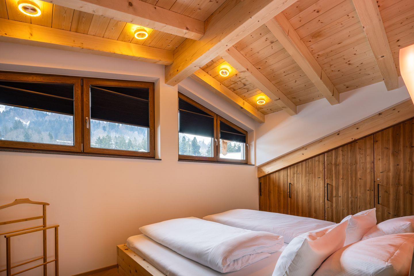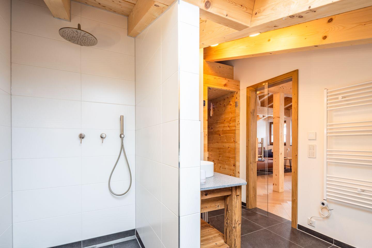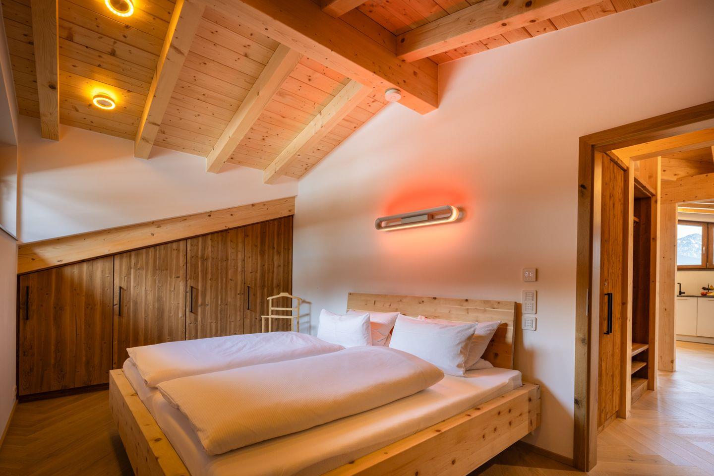 Das Schlafzimmer ist mit einem komfortablen Doppelbett aus Zirbenholz ausgestattet. Der natürliche Duft des Holzes sorgt für erholsamen Schlaf und ein besonderes Raumklima. Das moderne Badezimmer verfügt über eine großzügige Regendusche und eine private Zirbensauna mit zusätzlicher Infrarotfunktion, die nach einem aktiven Tag in den Bergen wohltuende Entspannung schenkt.