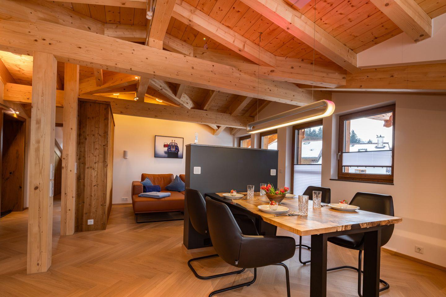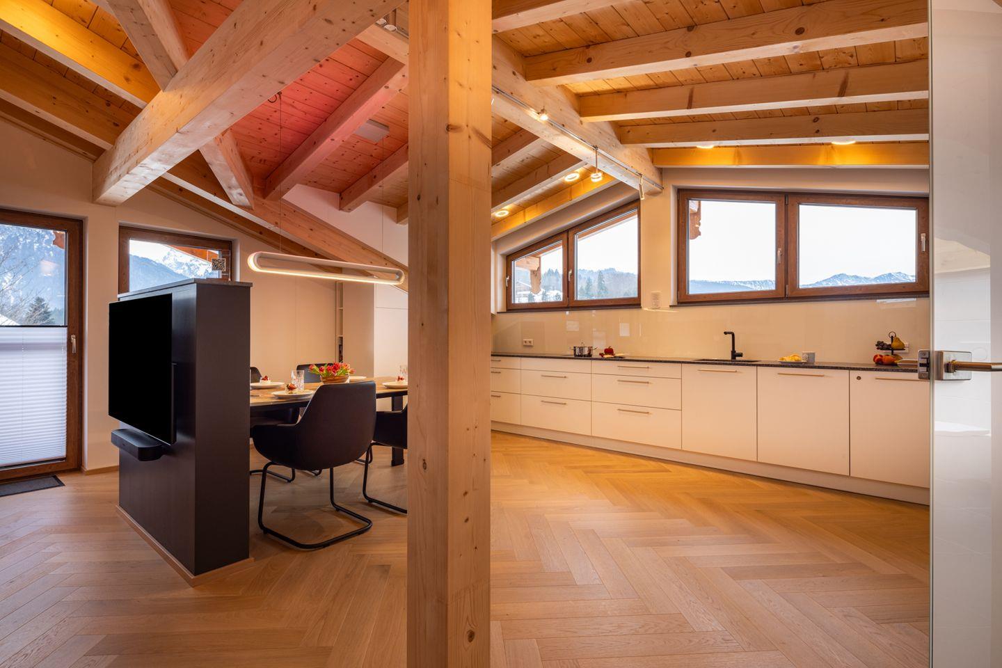 Der offen gestaltete Wohnbereich mit Küche ist das Herzstück der Wohnung. Große Fenster eröffnen den Blick auf die Berchtesgadener Bergwelt und lassen das wechselnde Licht der Alpen zu jeder Tageszeit spürbar werden. Die Küche ist vollständig ausgestattet, verfügt über eine Spülmaschine und eine hochwertige Naturstein-Arbeitsplatte und lädt zum gemeinsamen Kochen ein. Für zusätzlichen Komfort stehen WLAN, Smart TV und ein Sonos Soundsystem zur Verfügung. Auch Waschmaschine und Trockner sind vorhanden.