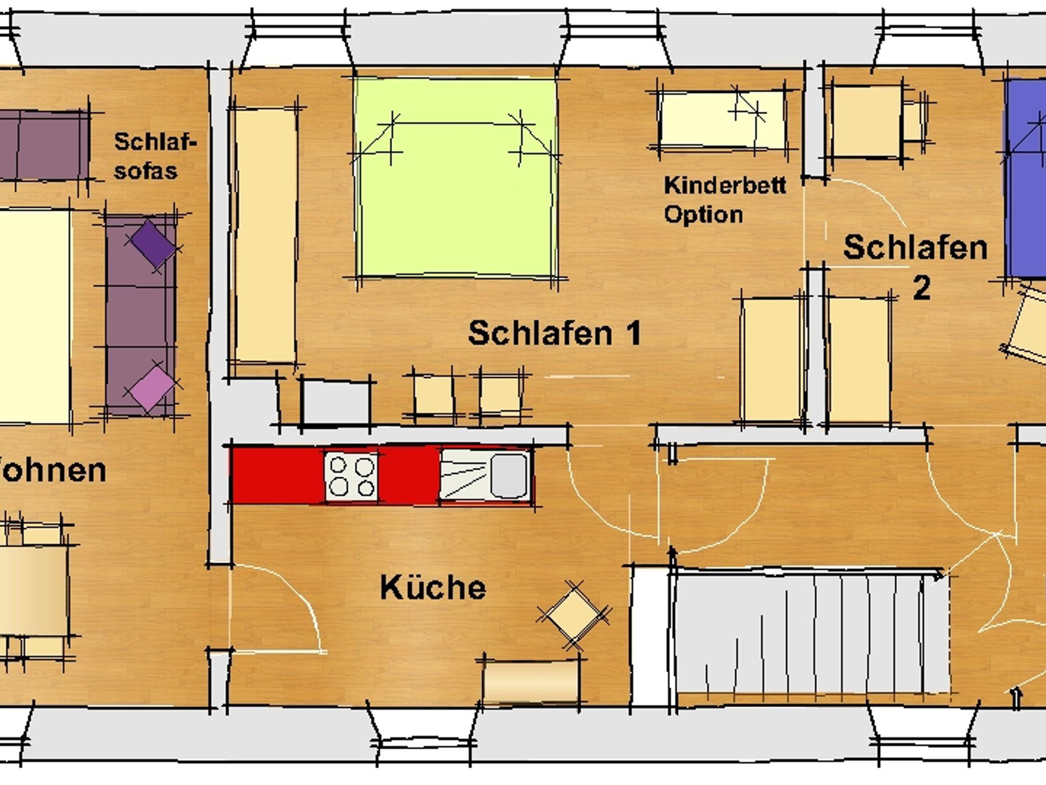 1 Schlafzimmer mit Doppelbett, 1 Schlafzimmer mit Einzelbett + Möglichkeit Zustellbett, Wohnzimmer mit 2 Schlaf-Sofas und Essbereich, Küche, Bad mit Dusche, separates WC, Handtücher und Bettwäsche inklusive.