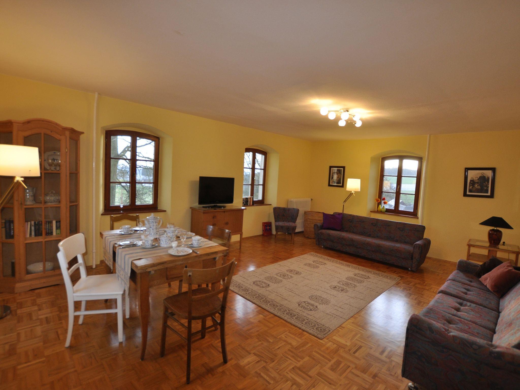 Die großzügige und geschmackvolle Wohnung liegt im 1. Stock des denkmalgeschützen Anwesens und bietet einen herrlichen Ausblick auf den Landhausgarten und die umliegende Wiesen. Parkettböden, historische und moderne Einrichtung in gelungener Kombination und das stimmige Designkonzept sind Grundlage der gehobenen Ausstattung. Im historischen Innenhof und im Garten bieten sich diverse Sitzmöglichkeiten und können jederzeit von unseren Gästen genützt werden. Außerdem finden Kinder Schaukeln, Sandspielzeug und Matschwasser in der historischen Viehtränke.