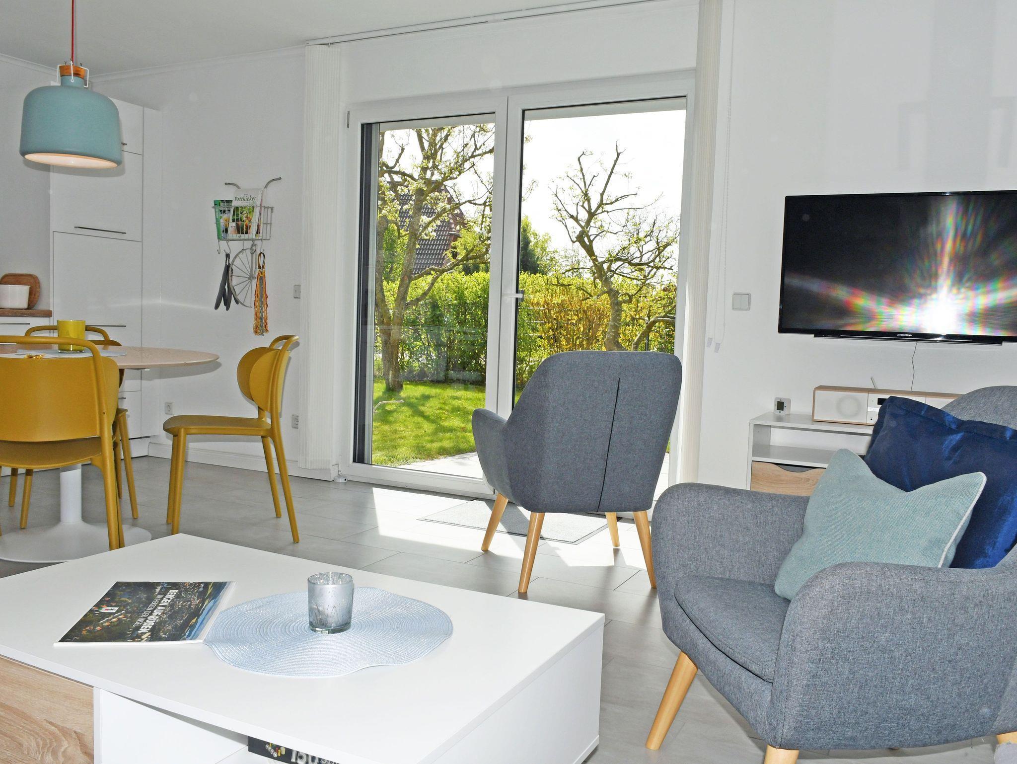 o einen Wohnbereich mit lichtdurchfluteter Wohnküche und großem runden Esstisch und Stühlen, Geschirrspüler, Ofen, Cerankochfeld, Kühlschrank mit Gefrierfach, Mikrowelle, Kaffeemaschine, Wasserkocher, Toaster, SAT-TV, Musikanlage mit CD und Bluetooth