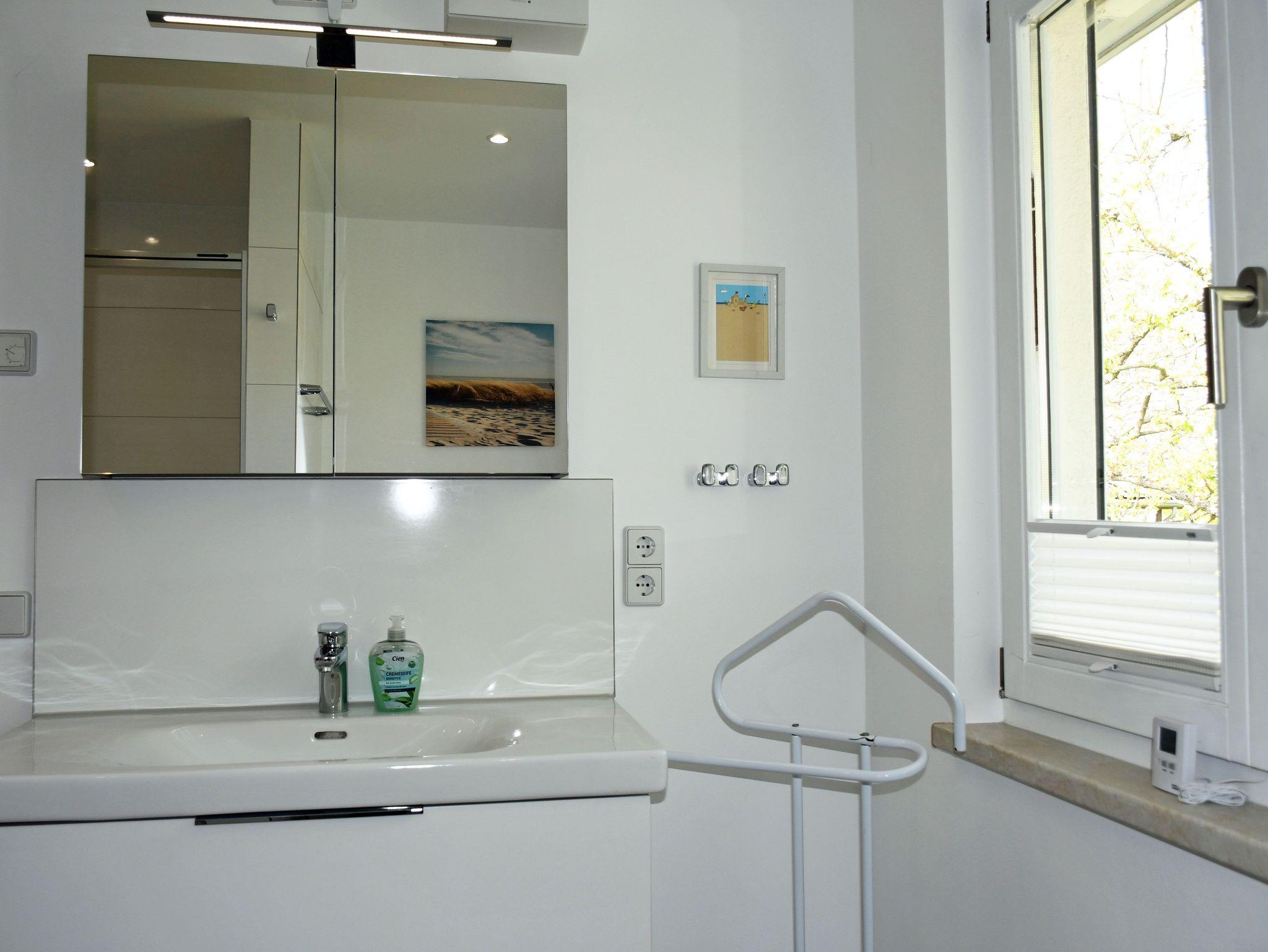 o ein geräumigen Wellnessbad mit großer Dusche und kleiner finnischer Sauna für 2 Personen