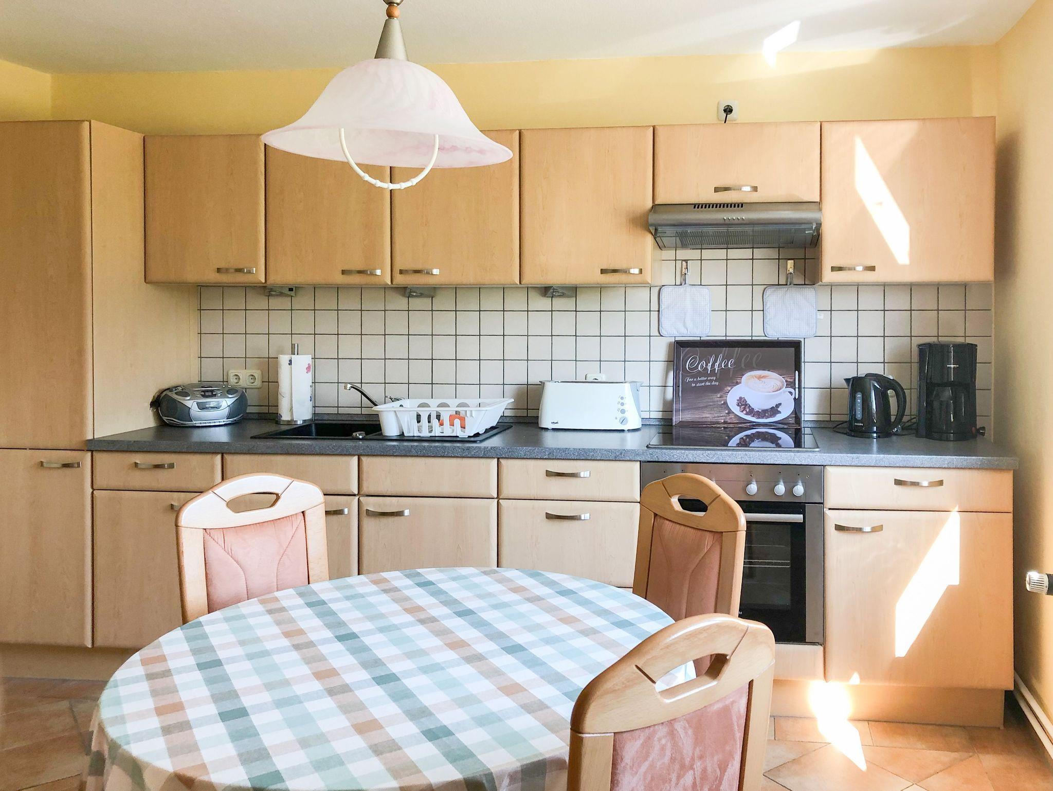 • eine voll ausgestattete Küche mit Essecke