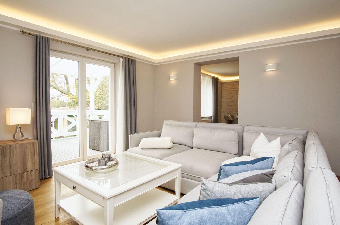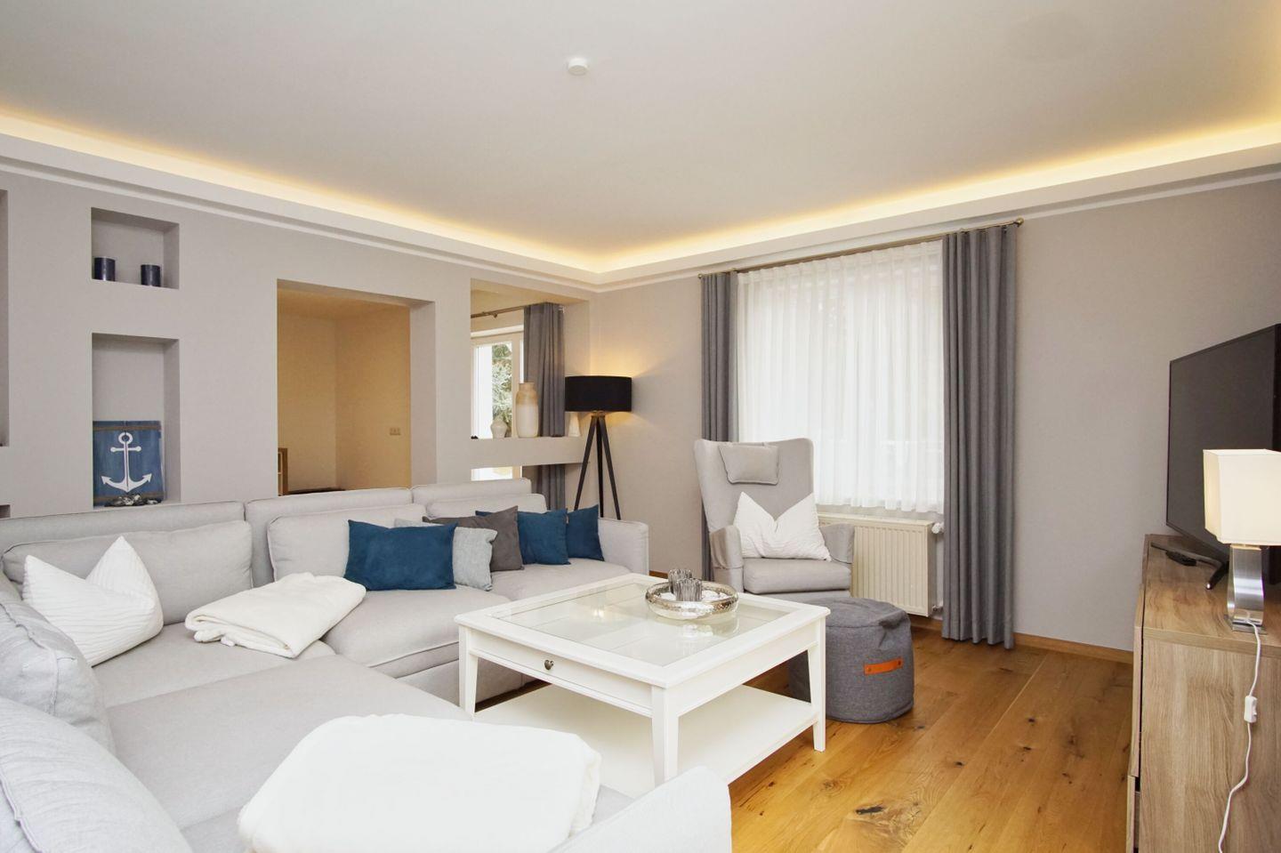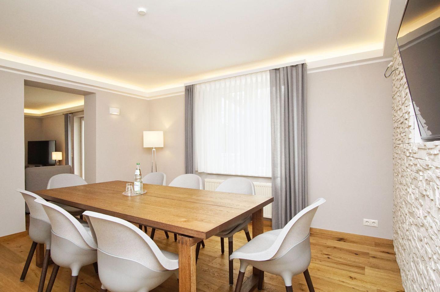 WOHNEN // Wohnraum mit bequemer Couch (Schlaffunktion), Flachbild-TV, separates Esszimmer mit großem Tisch und Flachbild-TV ++
