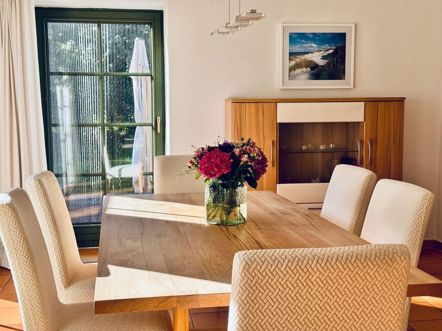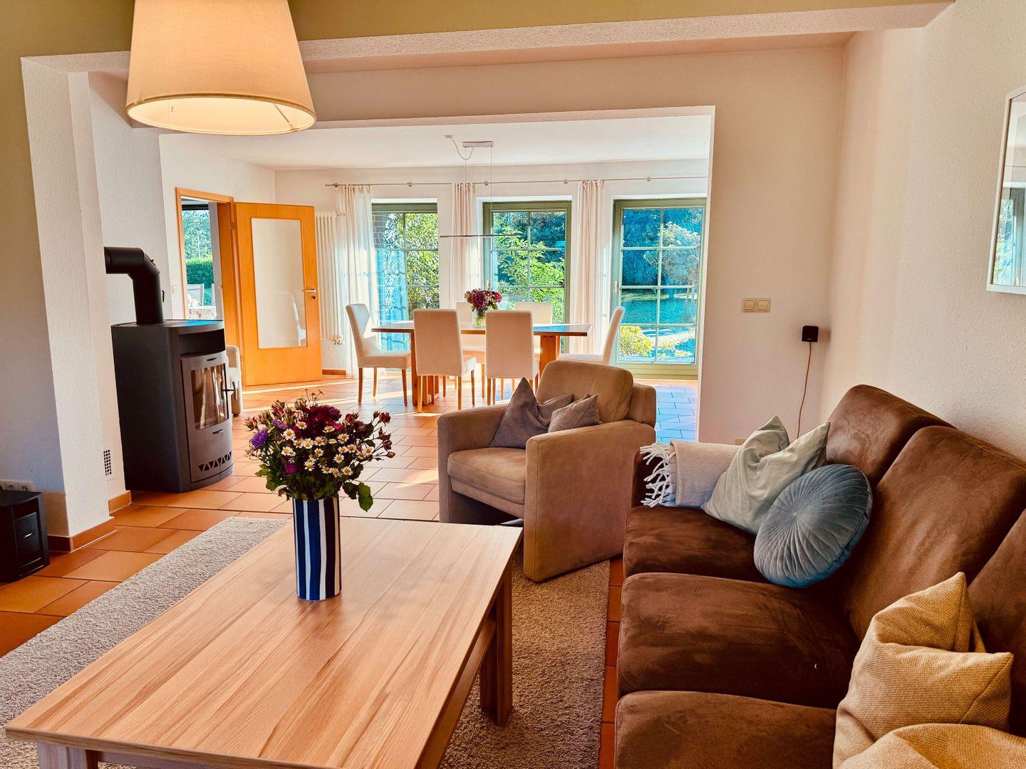 WOHNEN // Wohnraum mit Essbereich, bequemer Couchgarnitur, Kamin, Flachbild-TV, Zugang zur möblierten Terrasse ++