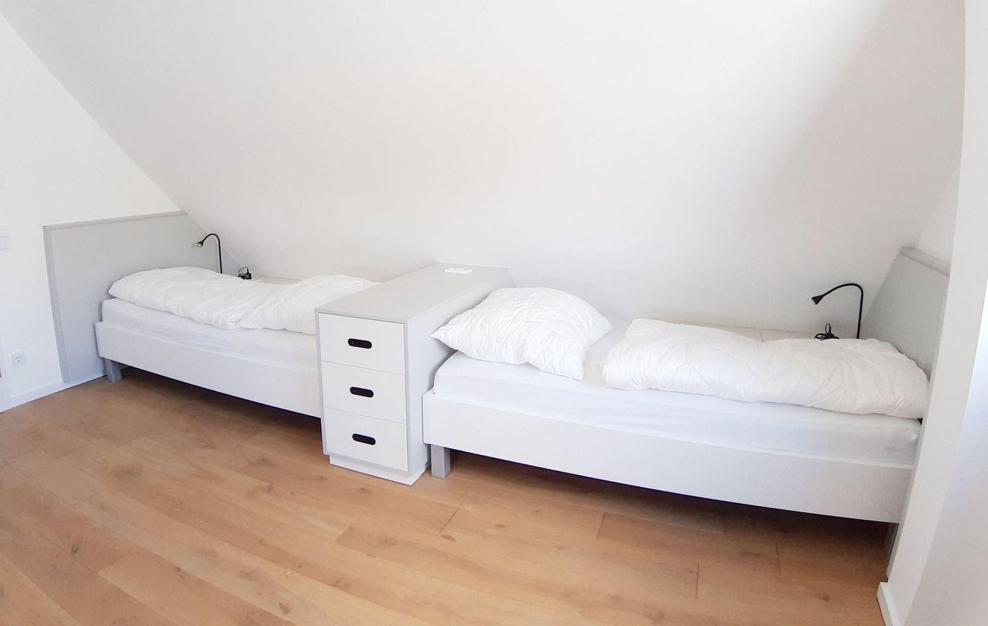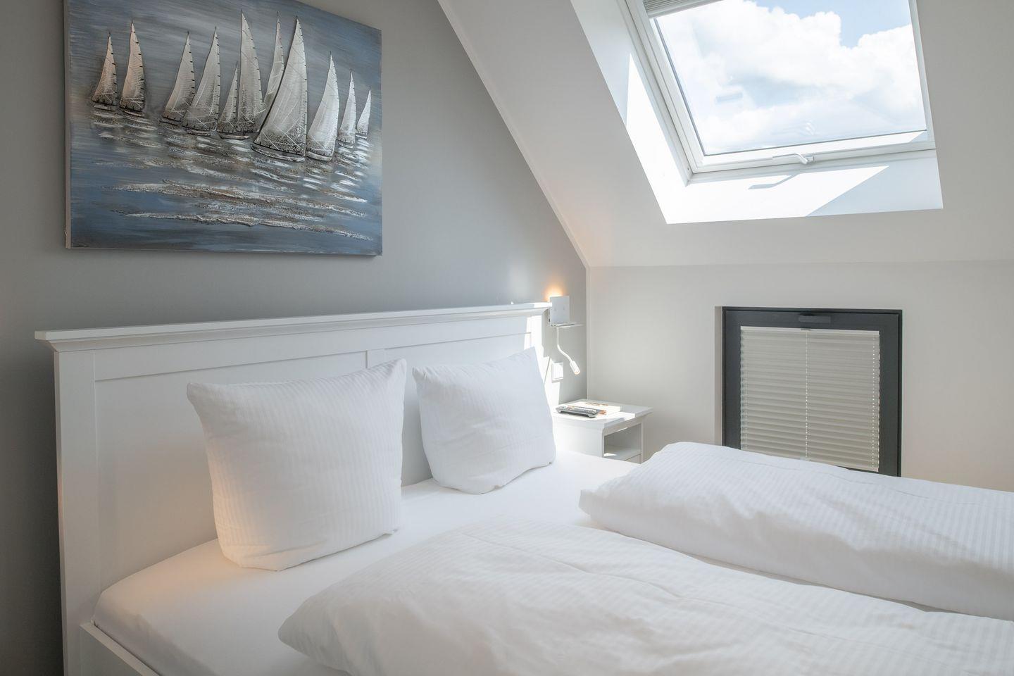 Im Spitzboden befinden sich zwei Einzelbetten sowie ein Arbeitsbereich mit Schreibtisch und Blick auf den Bodden. Selbstverständlich steht Ihnen schnelles WLAN mit Glasfaseranschluss zur Verfügung.
