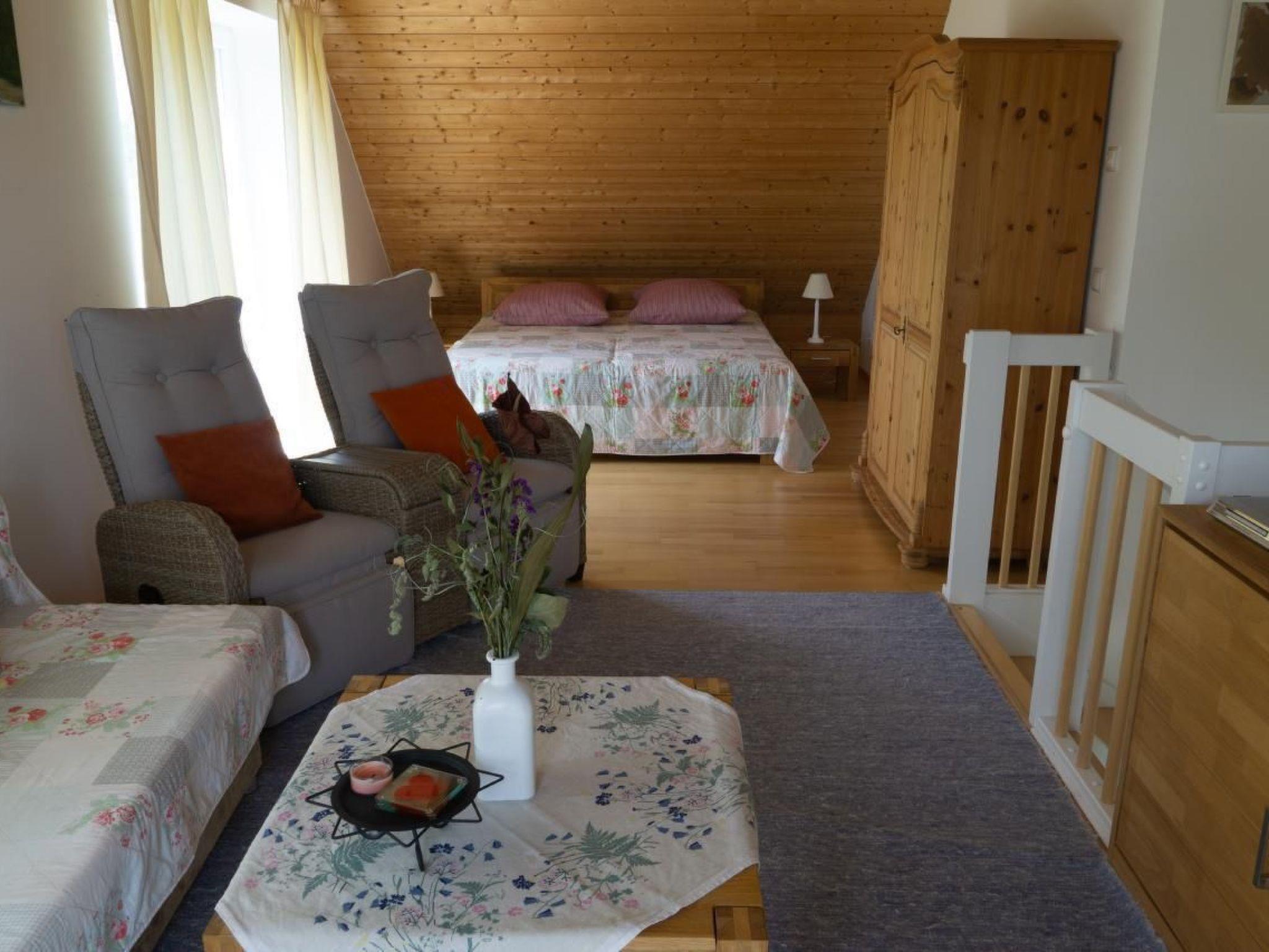 Inside, you will first be welcomed by a modern, high-quality fitted kitchen on the ground floor, which leaves nothing to be desired in terms of culinary delights. The adjoining bathroom with toilet completes the comfortable furnishings. The upper floor offers a combined living room and bedroom that can comfortably accommodate up to 3 people. Large windows facing south and west open up the view of the greenery and bathe the room in natural light.