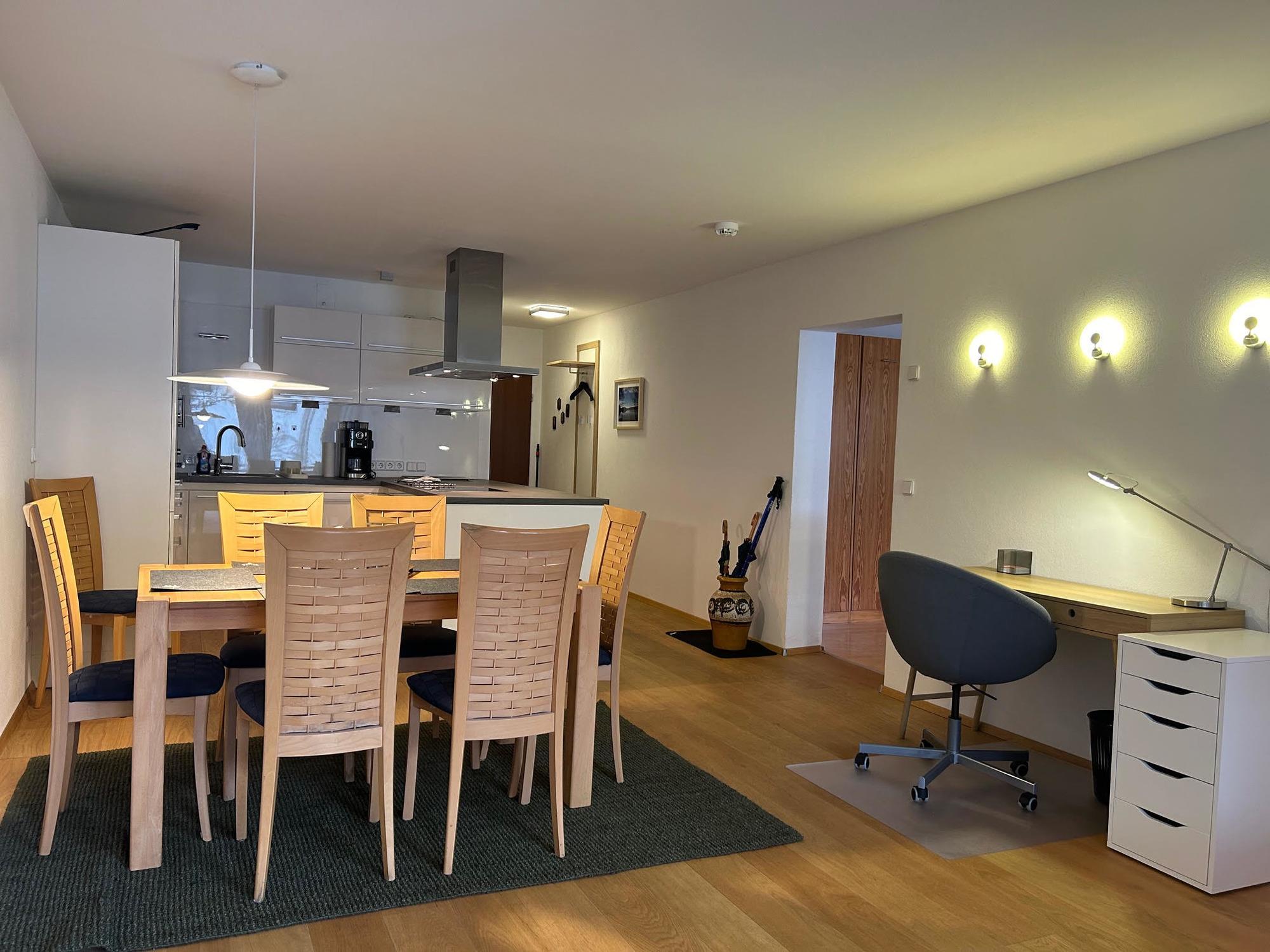 Die Ferienwohnung überzeugt durch ihre moderne Ausstattung und durchdachte Raumaufteilung. Ein geräumiges Schlafzimmer, zwei gemütliche Schrankbetten im Wohnzimmer sowie eine einladende Schlafcouch im Wohnbereich bieten ausreichend Schlafmöglichkeiten für alle Gäste. Die große und helle Küche ist mit einem Geschirrspüler, Ofen, Mikrowelle und einem großen Kühlschrank ausgestattet, sodass Sie Ihrer Kochleidenschaft freien Lauf lassen können. Genießen Sie gemeinsame Mahlzeiten am Essplatz oder arbeiten Sie konzentriert am Schreibtisch – hier finden Sie den perfekten Platz für jede Aktivität.