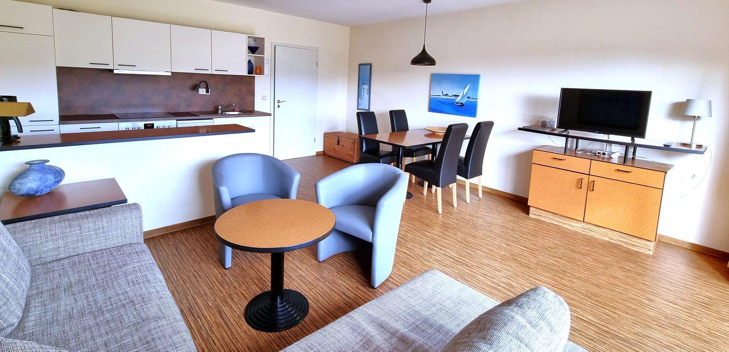 Der offene Wohnbereich mit bequemer Doppelschlafcouch und Sesseln lädt zum Entspannen ein. Dank der großen bodentiefen Fenster ist der Raum lichtdurchflutet und vermittelt ein angenehmes Wohngefühl.