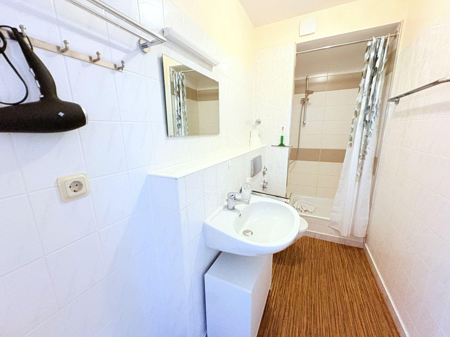 Das moderne Badezimmer verfügt über Dusche und WC.