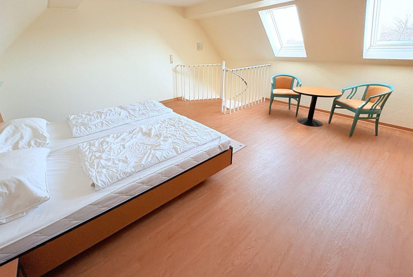Über eine Wendeltreppe erreichen Sie das Dachgeschoss mit einem weiteren offenen Schlafbereich, ausgestattet mit Doppelbett und gemütlicher Sitzecke.