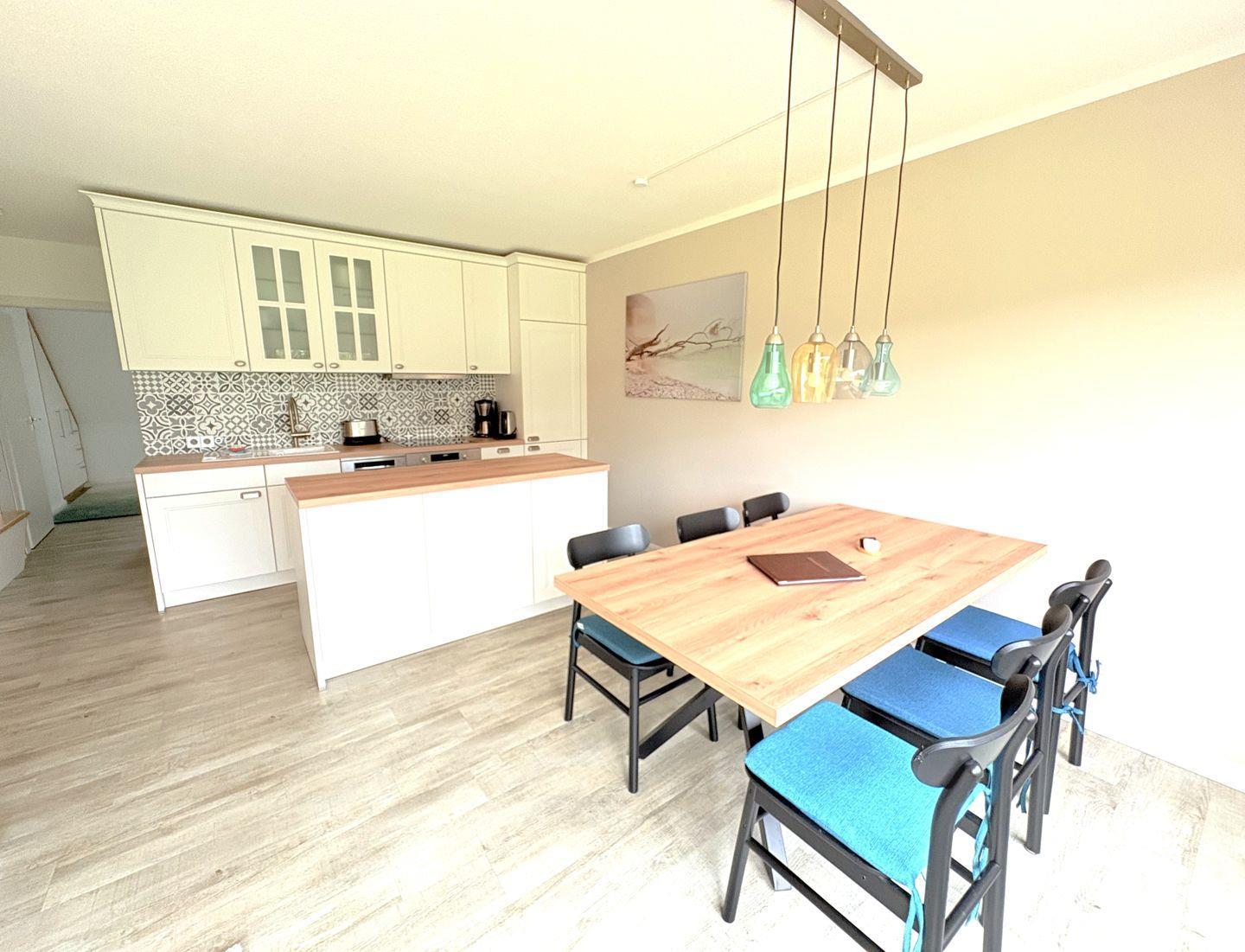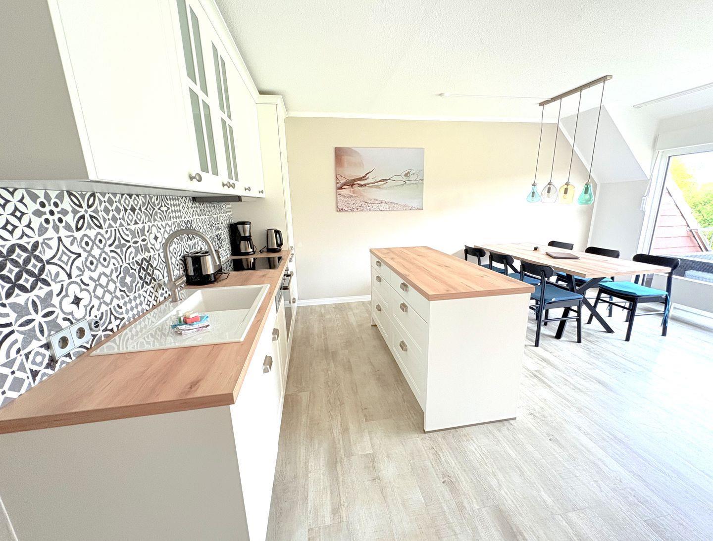 Im oberen Bereich lädt der offene Wohn- und Küchenbereich mit großem Esstisch zum gemeinsamen Kochen und Essen. Die gut ausgestattete Küche bietet alles, was Sie für die Zubereitung Ihrer Lieblingsgerichte benötigen.