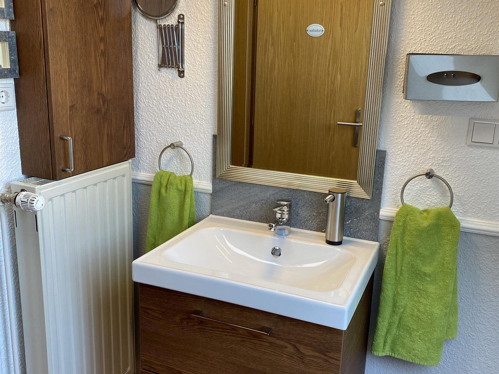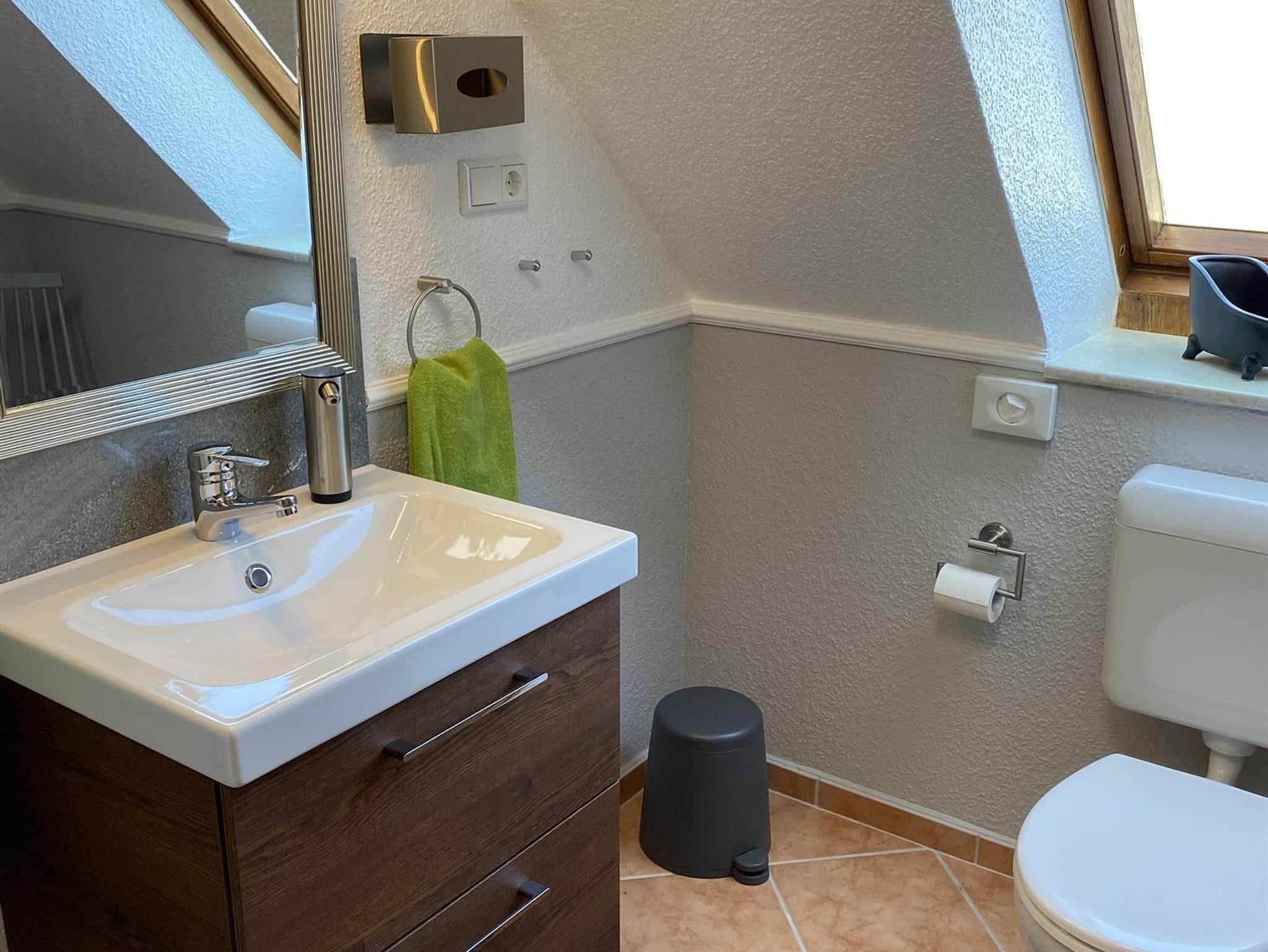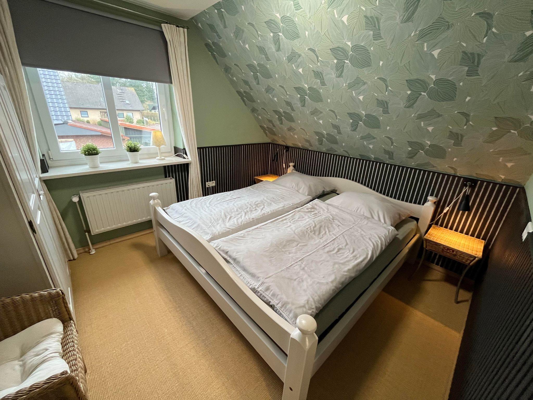 Vollausgestattete Ferienwohnung im Obergeschoss. Im großen Schlafzimmer ist ein Doppelbett 1,80 x 2,00m sowie ein Flachbildfernseher vorhanden. In dem zweiten (kleinen) Schlafraum steht den Gästen ein Einzelbett 0,90 x 2,00m zur Verfügung. Die Küche ist mit einem Induktionsherd, Kühlschrank, Kaffeemaschine, Mikrowelle, Wasserkocher und einem Geschirrspüler ausgestattet. Im Wohnzimmer befindet sich ein Flachbildfernseher und ein Esstisch. Vom Wohnzimmer aus können Sie auf den Balkon gehen.
