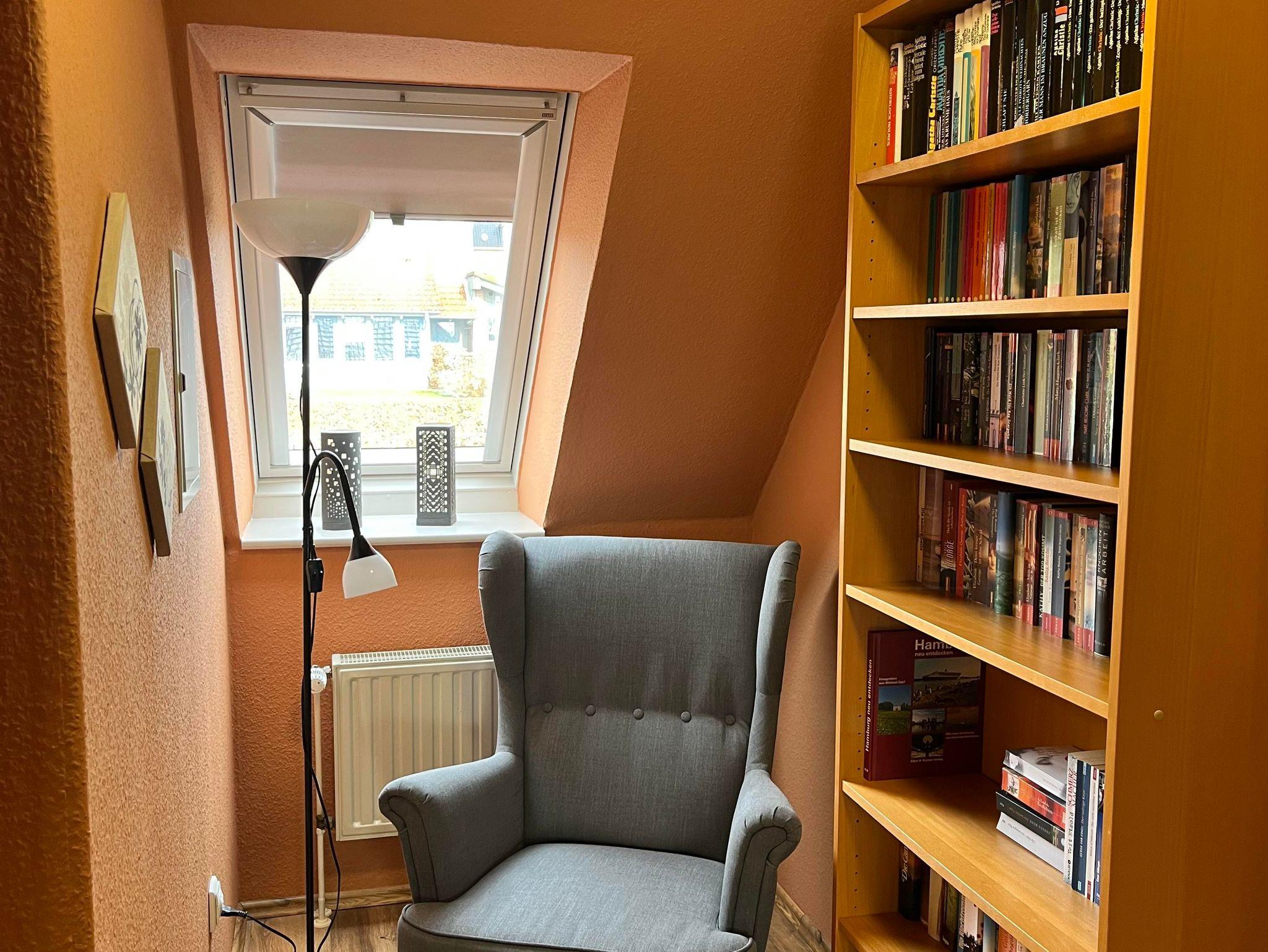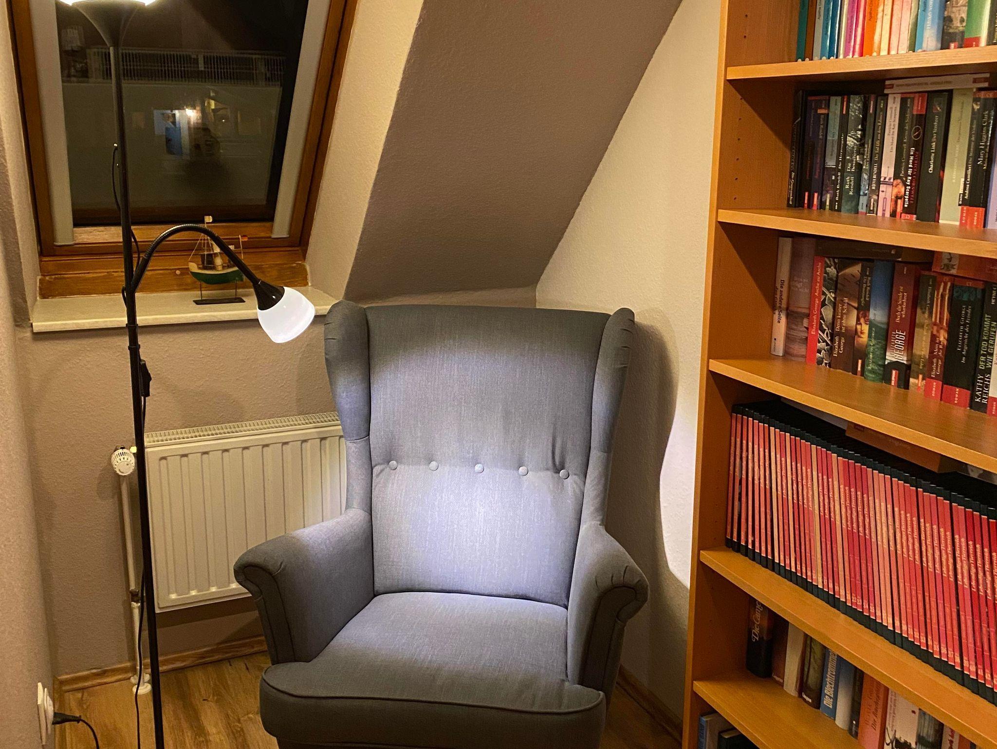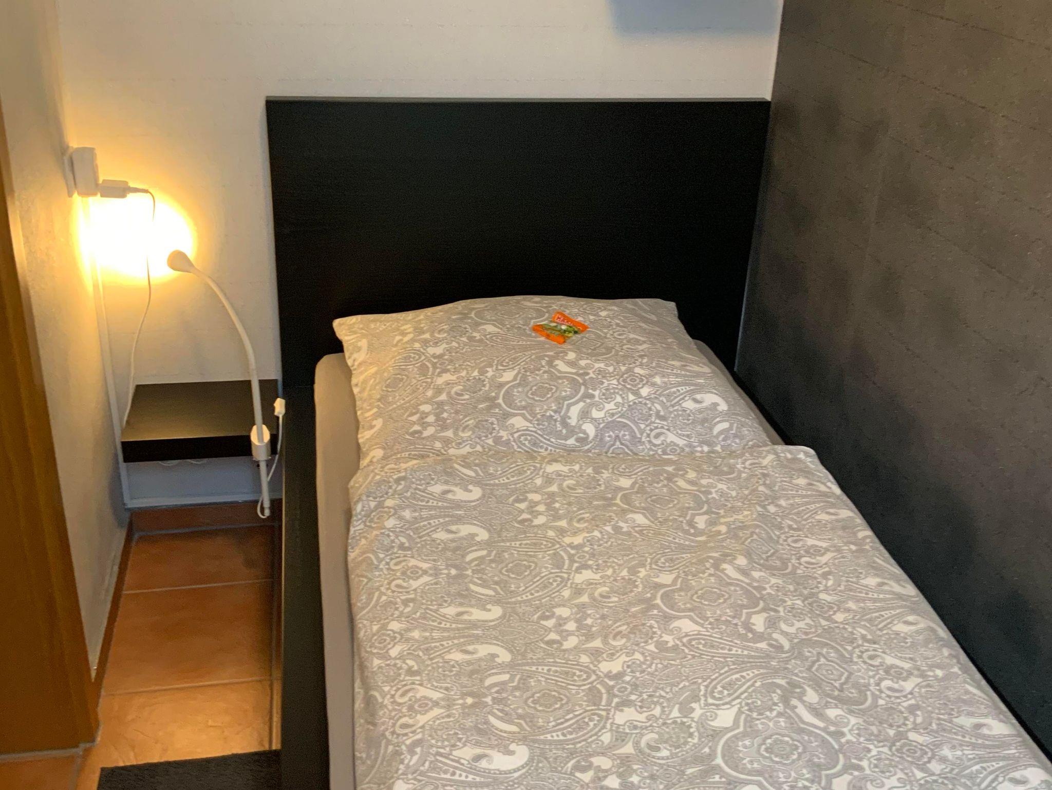 Vollausgestattete Ferienwohnung im Obergeschoss. Im großen Schlafzimmer ist ein Doppelbett 1,80 x 2,00m sowie ein Flachbildfernseher vorhanden. In dem zweiten (kleinen) Schlafraum steht den Gästen ein Einzelbett 0,90 x 2,00m zur Verfügung. Die Küche ist mit einem Induktionsherd, Kühlschrank, Kaffeemaschine, Mikrowelle, Wasserkocher und einem Geschirrspüler ausgestattet. Im Wohnzimmer befindet sich ein Flachbildfernseher und ein Esstisch. Vom Wohnzimmer aus können Sie auf den Balkon gehen.