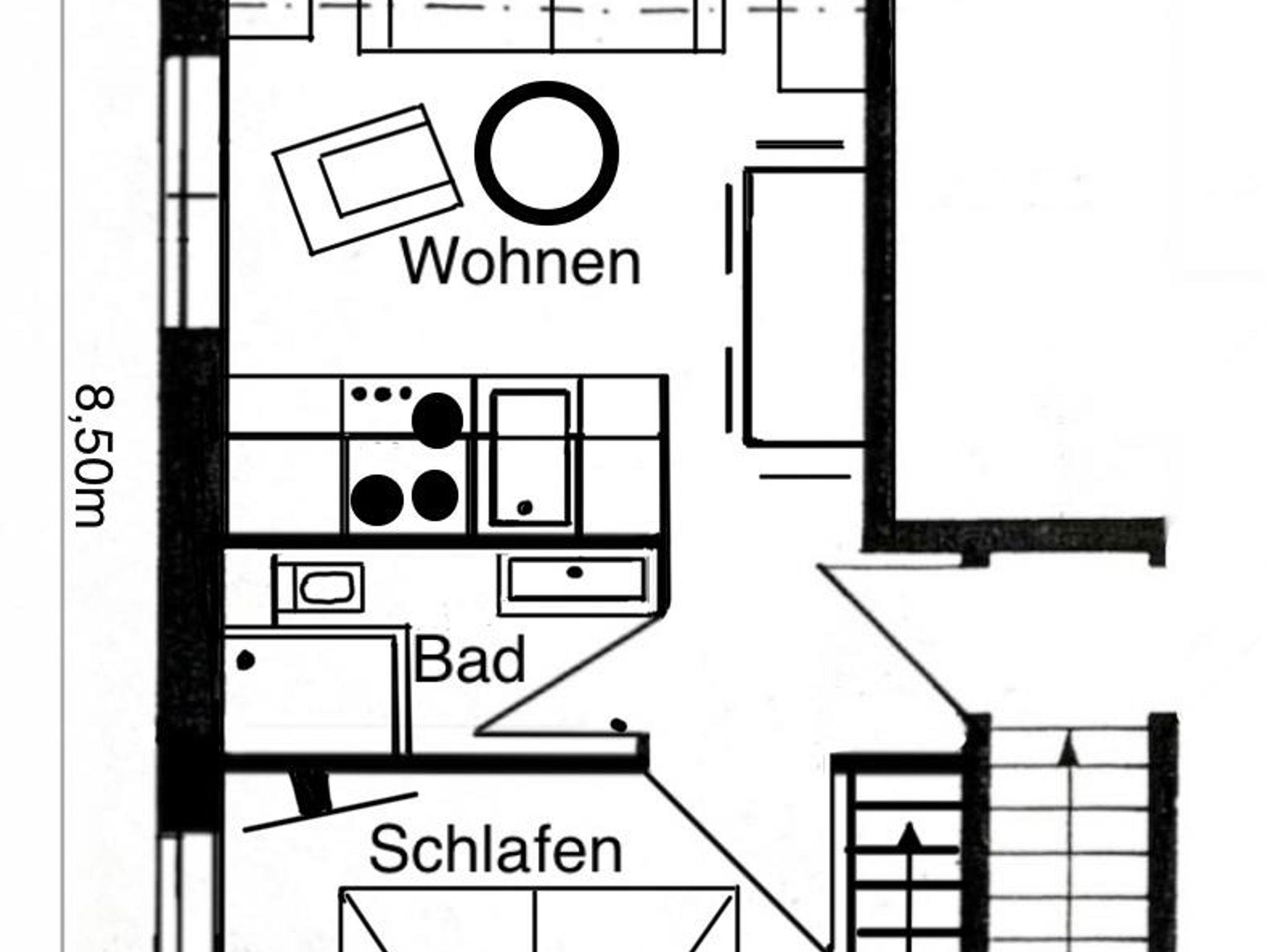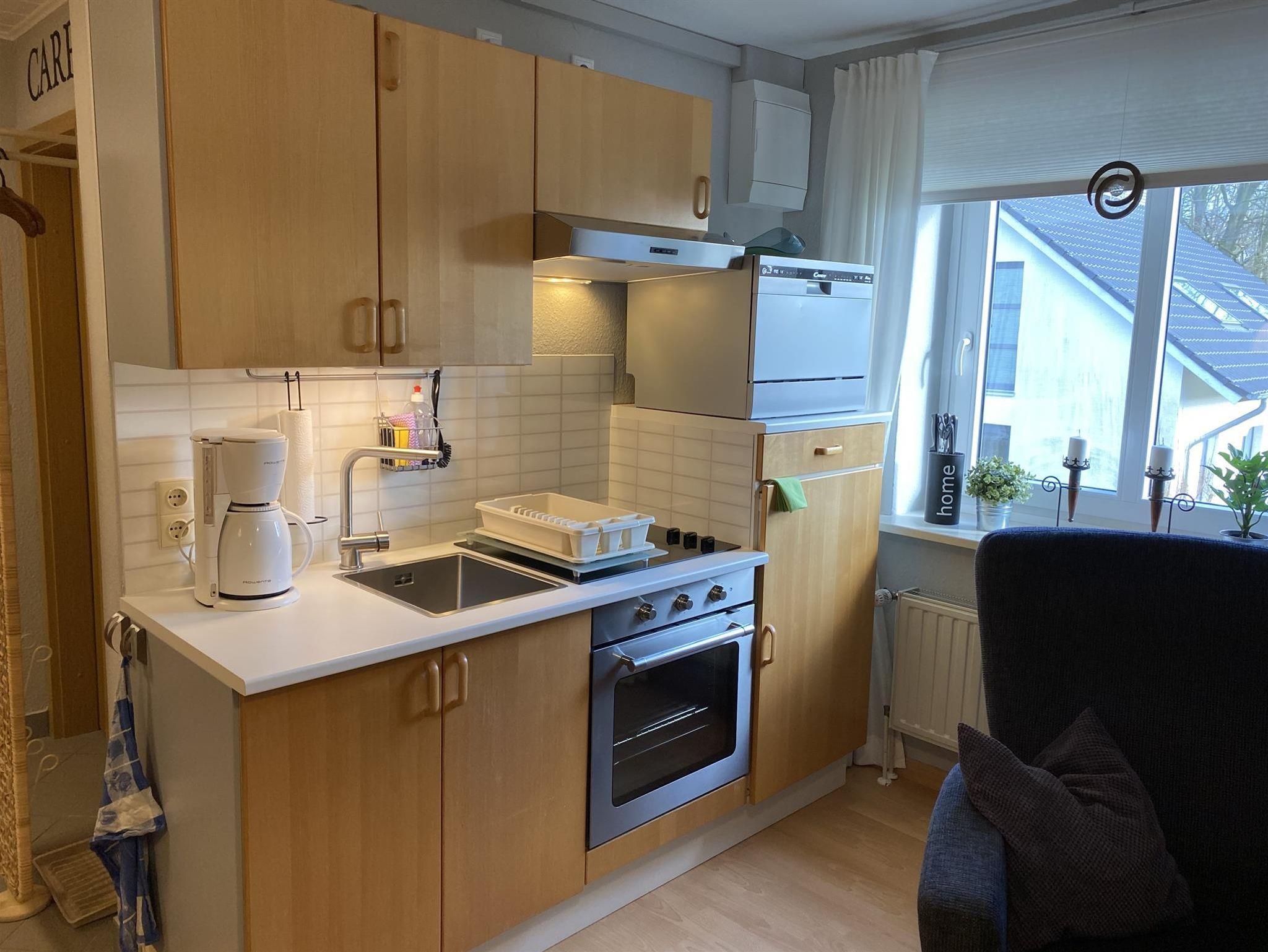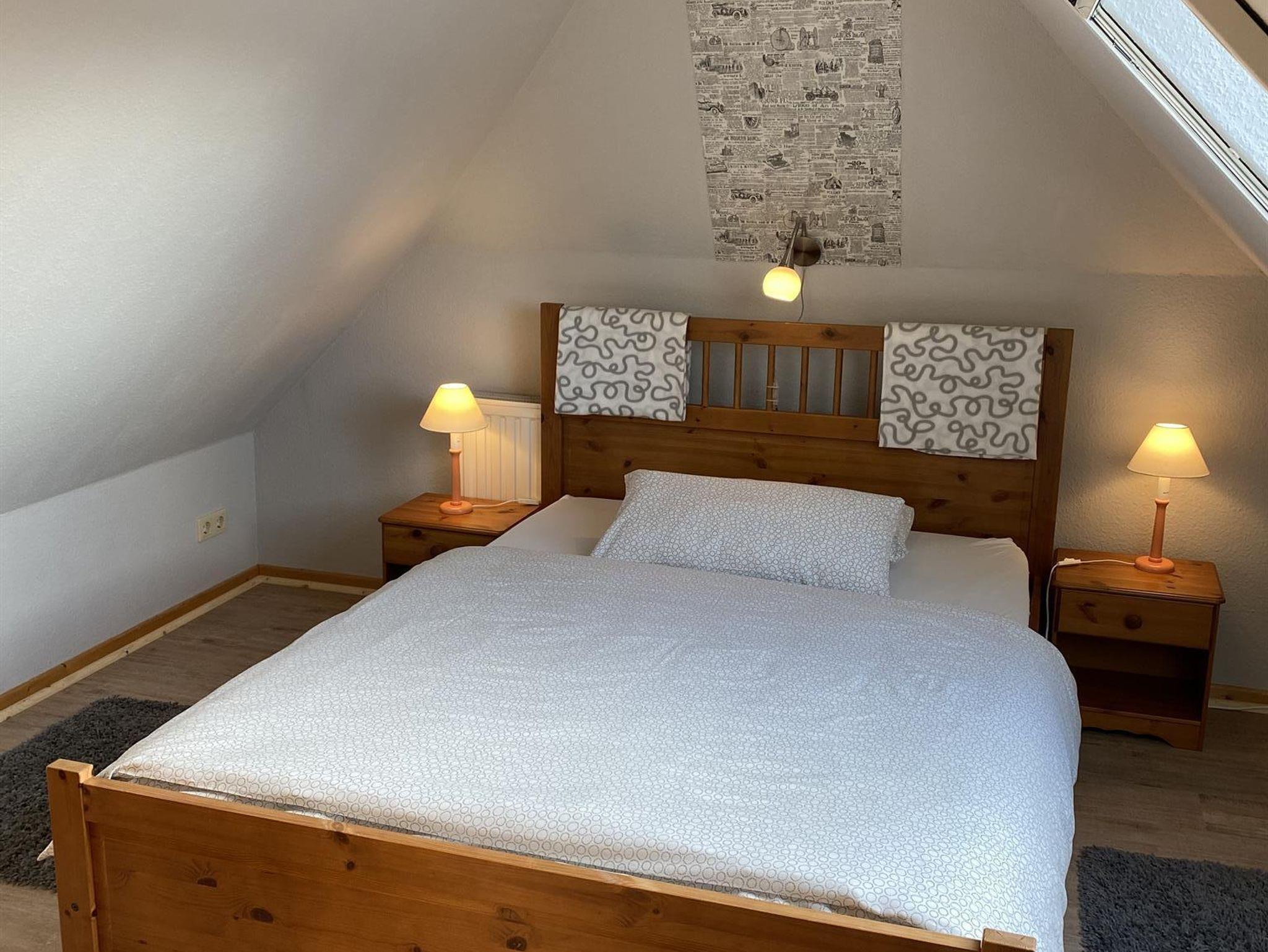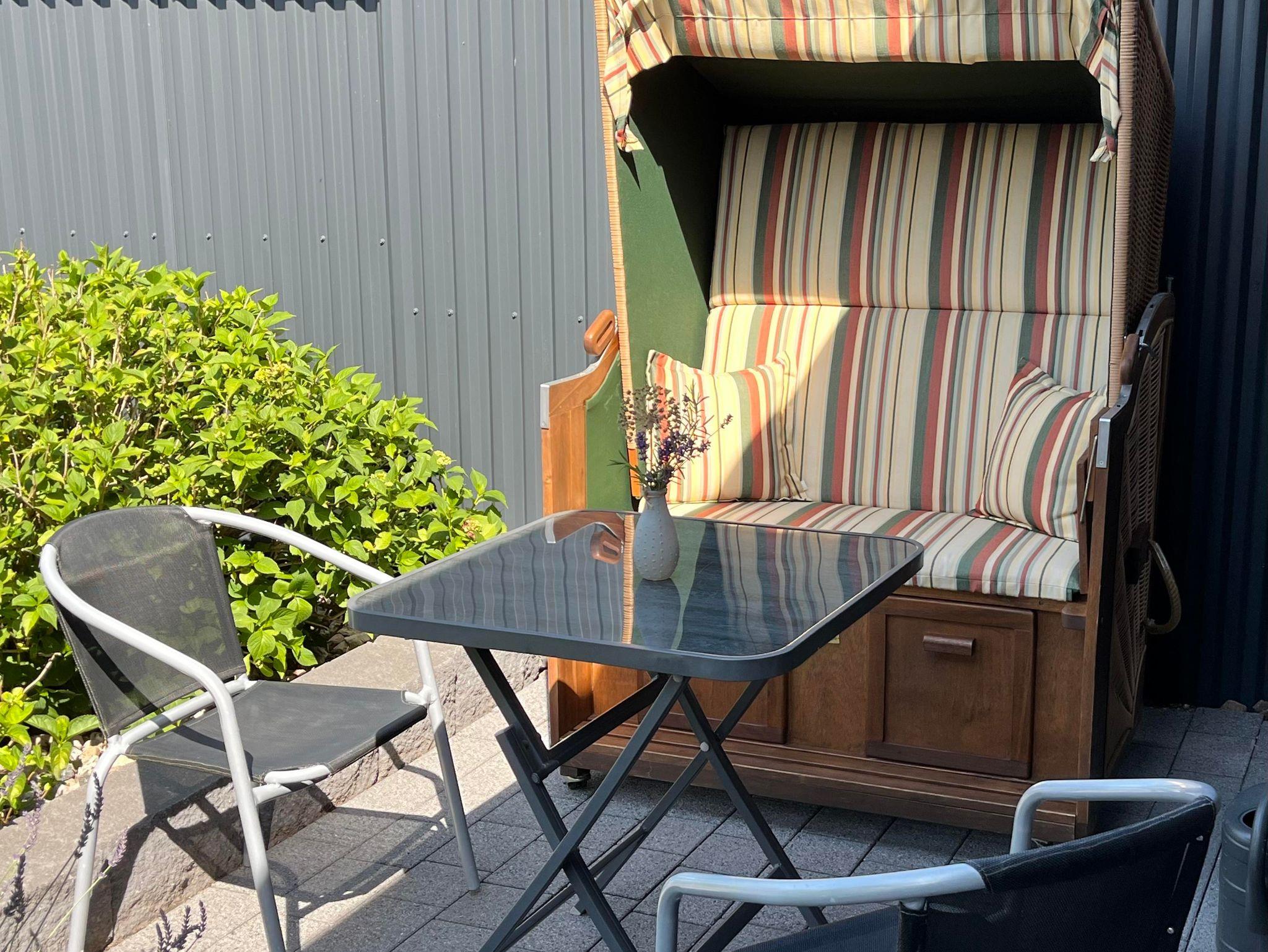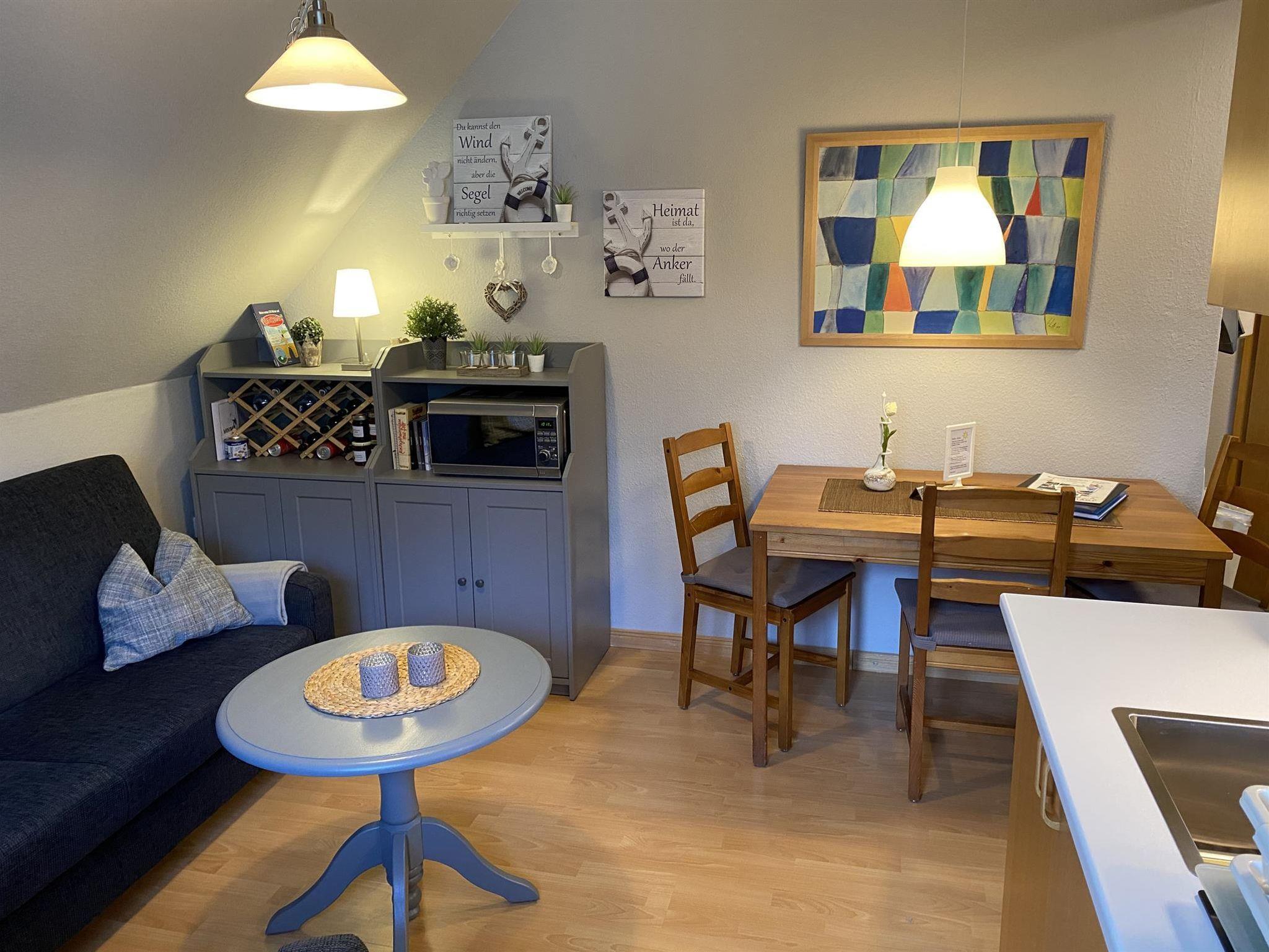 Die kleine Ferienwohnung liegt im Obergeschoß und bietet Platz für 2-4 Personen. Die Wohnküche ist komplett ausgestattet mit Herd (3 Platten), Backofen, Geschirrspüler, Mikrowelle, Kühlschrank, Kaffeemaschine und Wasserkocher. Das eine Schlafzimmer ist mit einem Doppelbett 1,80 x 2,00m ausgestattet. Über eine steile Treppe im Schlafzimmer erreicht man den oberen abgetrennten Schlafraum mit einem weiteren Doppelbett 1,40 x 2,00m. Es ist ein kleines Duschbad vorhanden. Wohnküche sowie beide Schlafräume verfügen über ein LED Farbfernsehgerät. Im Vorgarten befindet sich (nur für diese Wohnung,) eine kleine Terrasse mit einem Strandkorb und Gartenmöbeln.