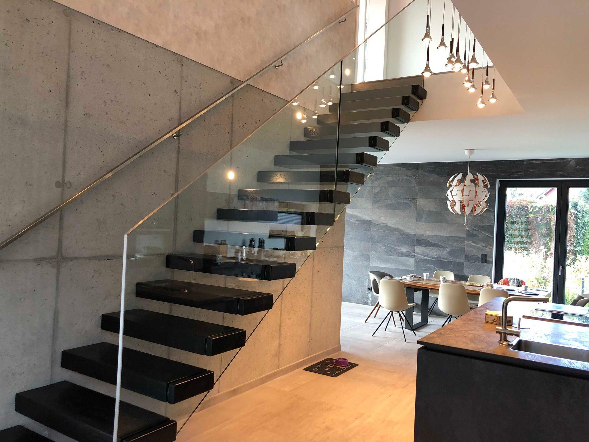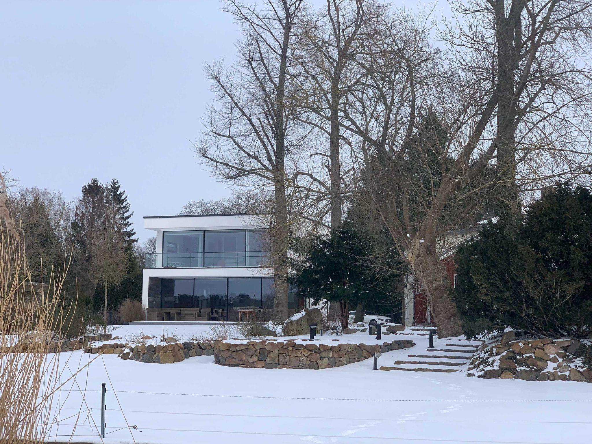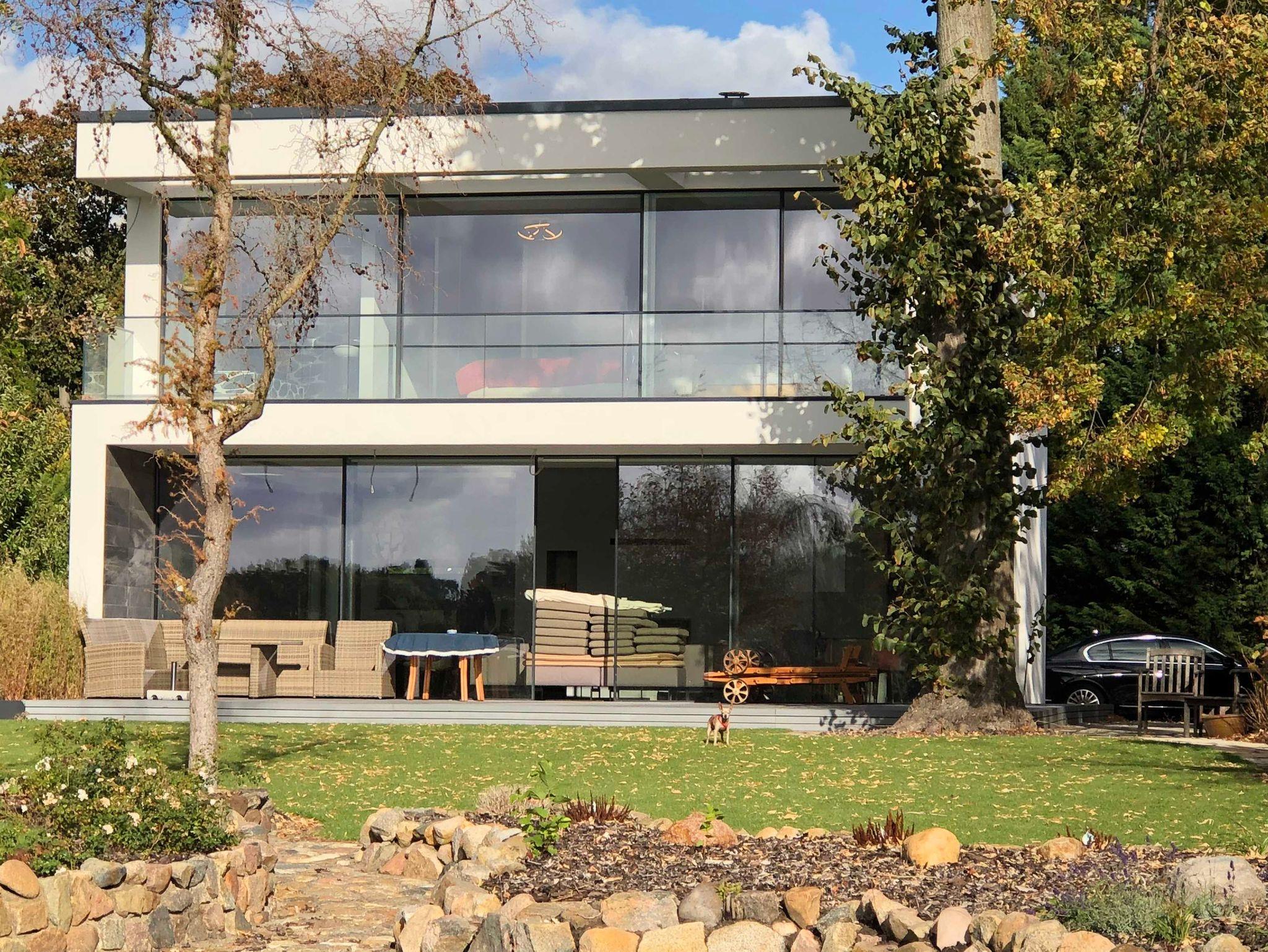 In Anlehnung an den Bauhausstil wurde das exklusive Haus seeseitig mit boden- und deckenhohen Fenstern und Glasschiebetüren errichtet.