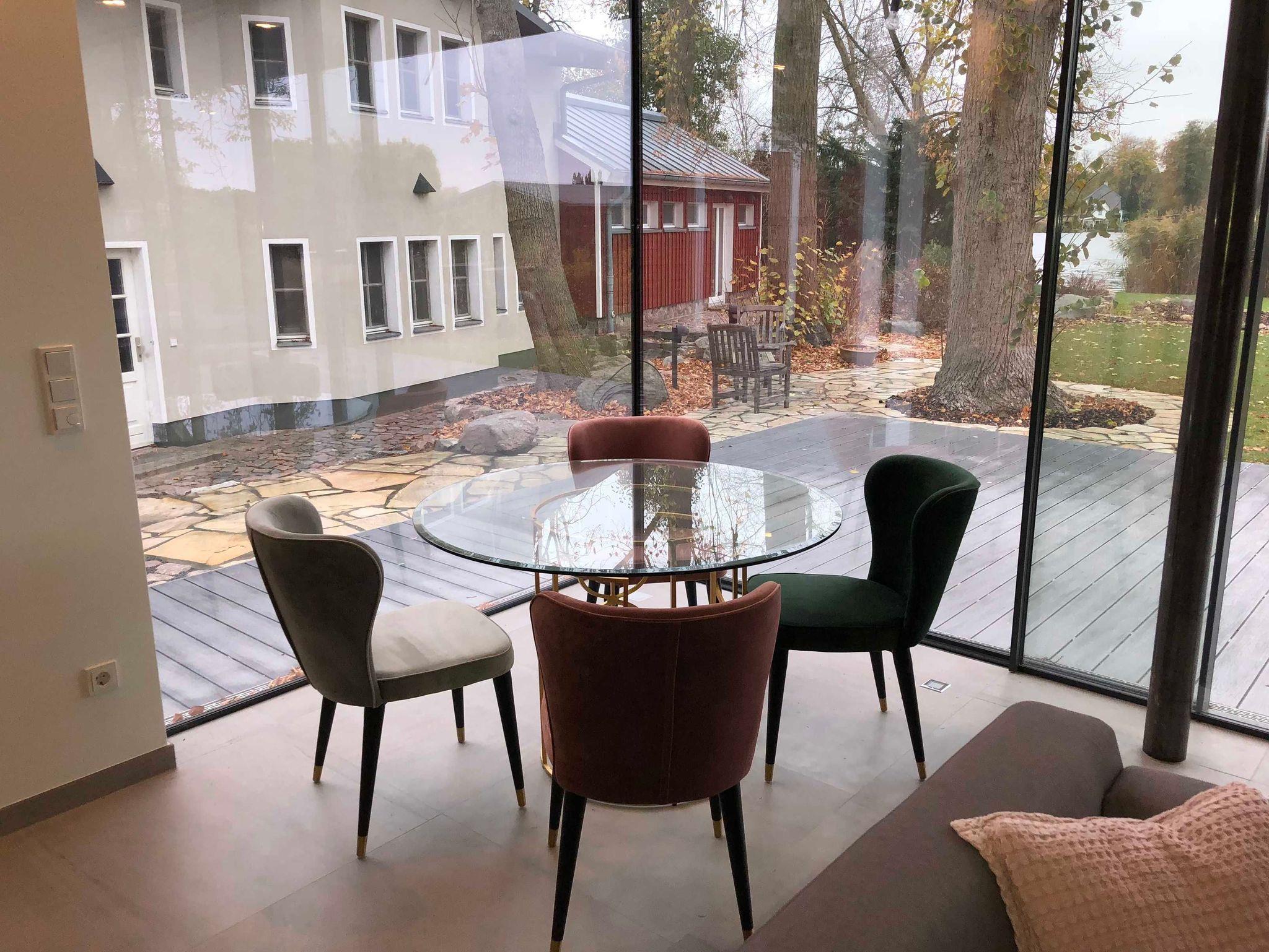 Durch die großen Fenster haben Sie einen herrlichen Blick auf das Grundstück in Richtung See.
