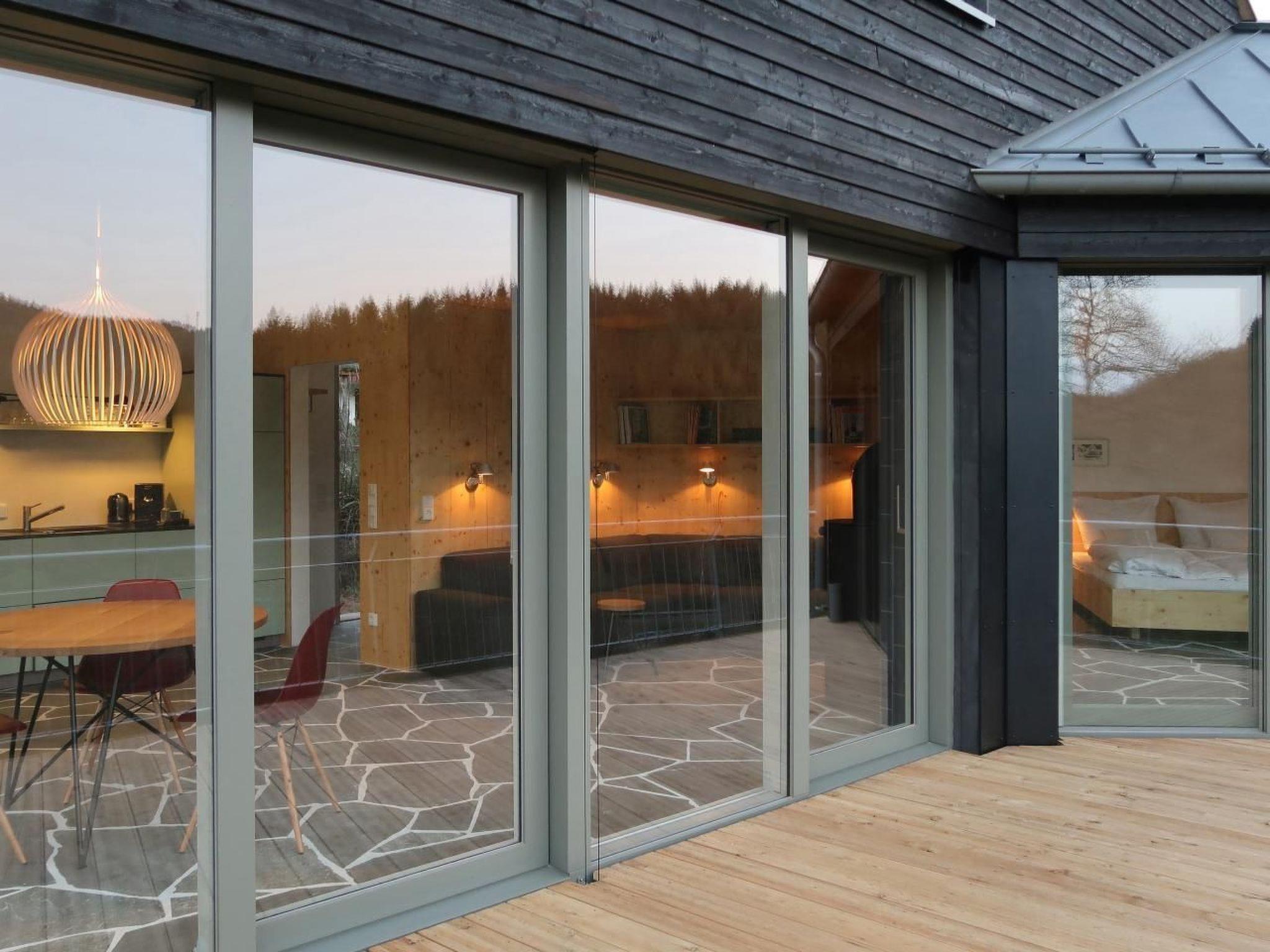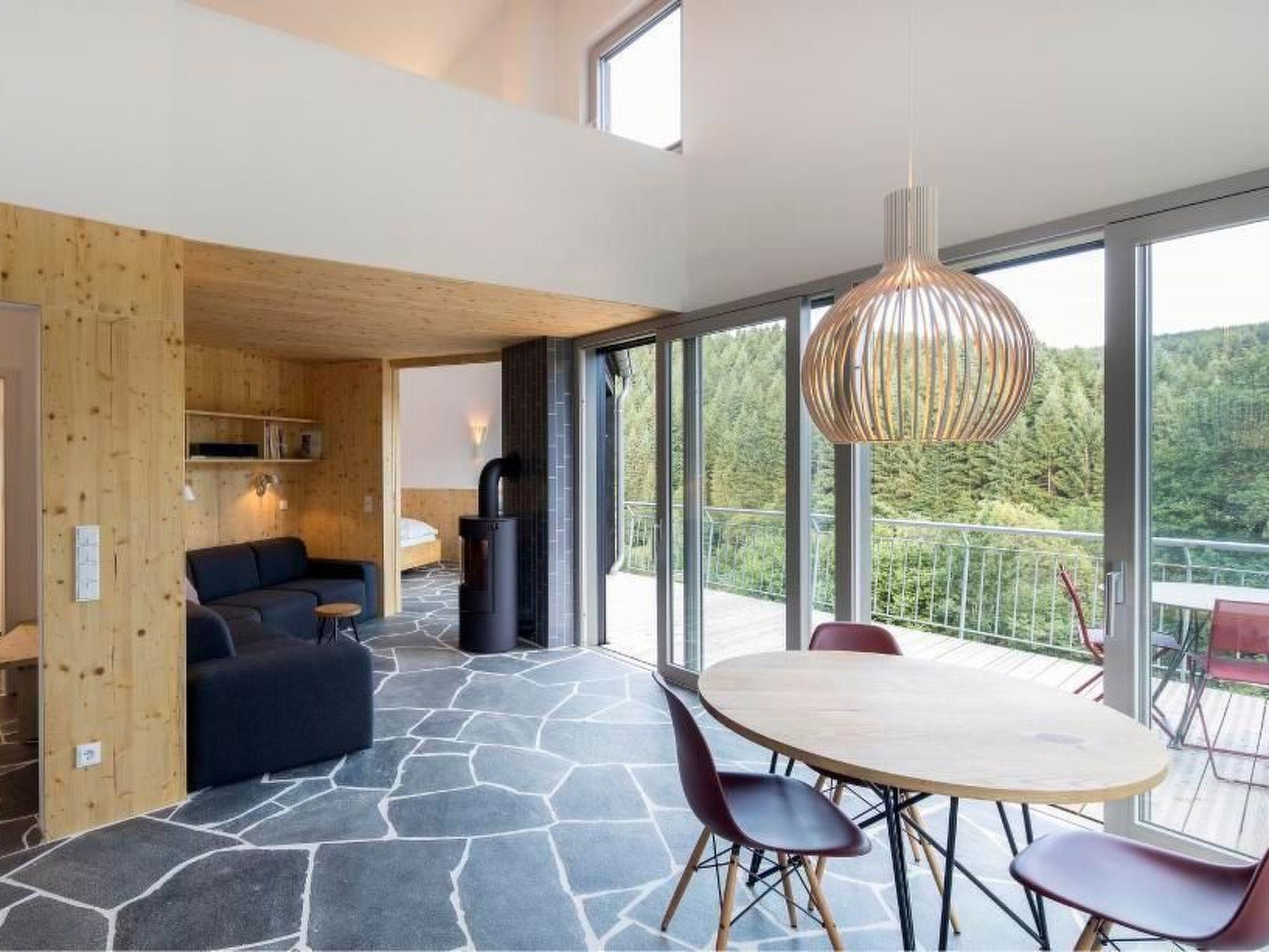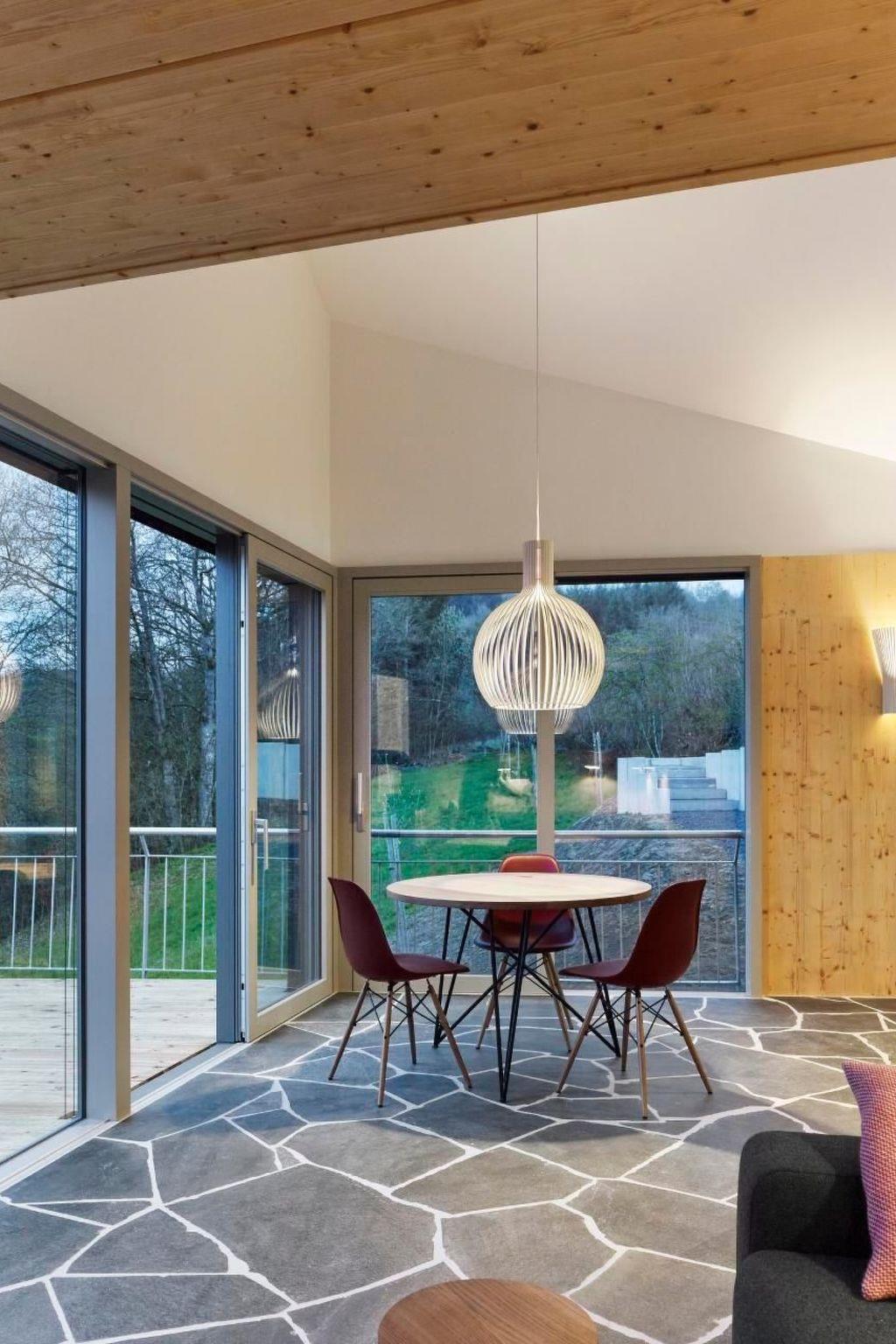 An entrance on the hillside opens up to the living and dining room with kitchenette. This high-ceilinged room opens up to the rising roof and exudes generosity. The rising roof and the large ribbon window give the living space a strong focus on the view of the valley. The living area with its high ceilings leads into the "fireplace room". This area occupies the inner corner of the house and is the most intimate part of the room sequence. With its greatly reduced ceiling height and the closed two-sided rear wall, the room offers a sheltered corner from whose built-in sofas both the open fire in the inner corner and the view of the valley can be viewed.
