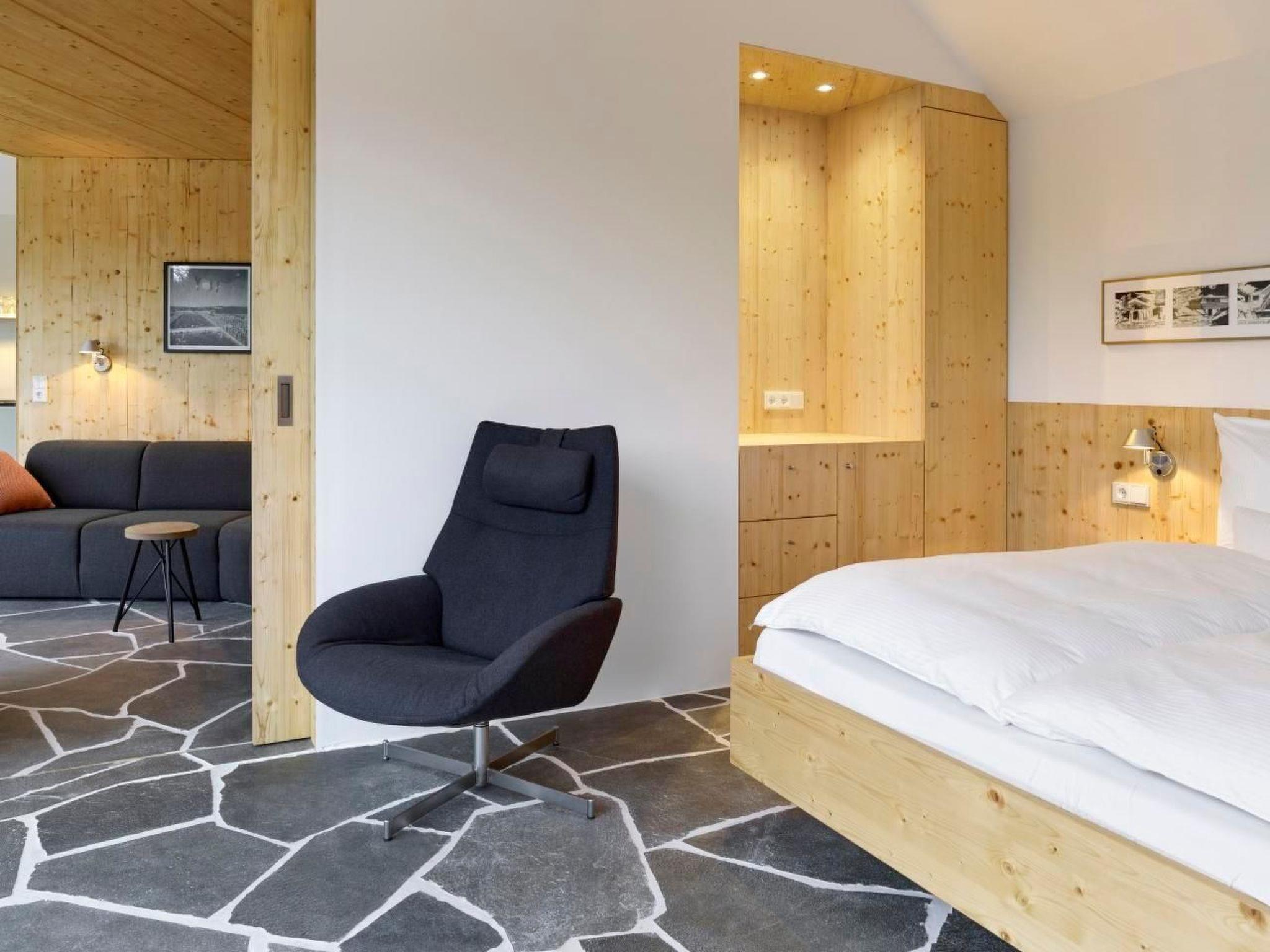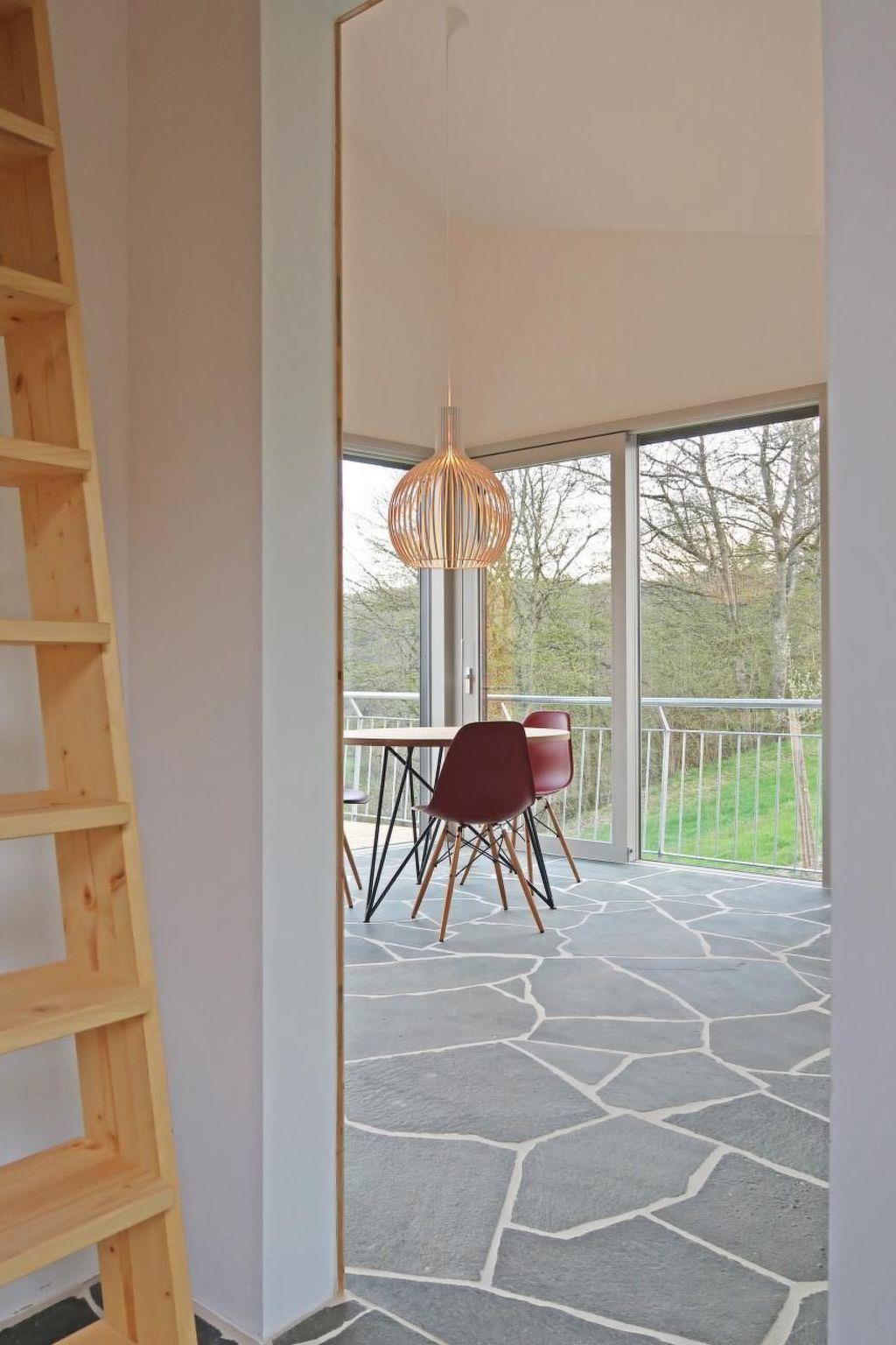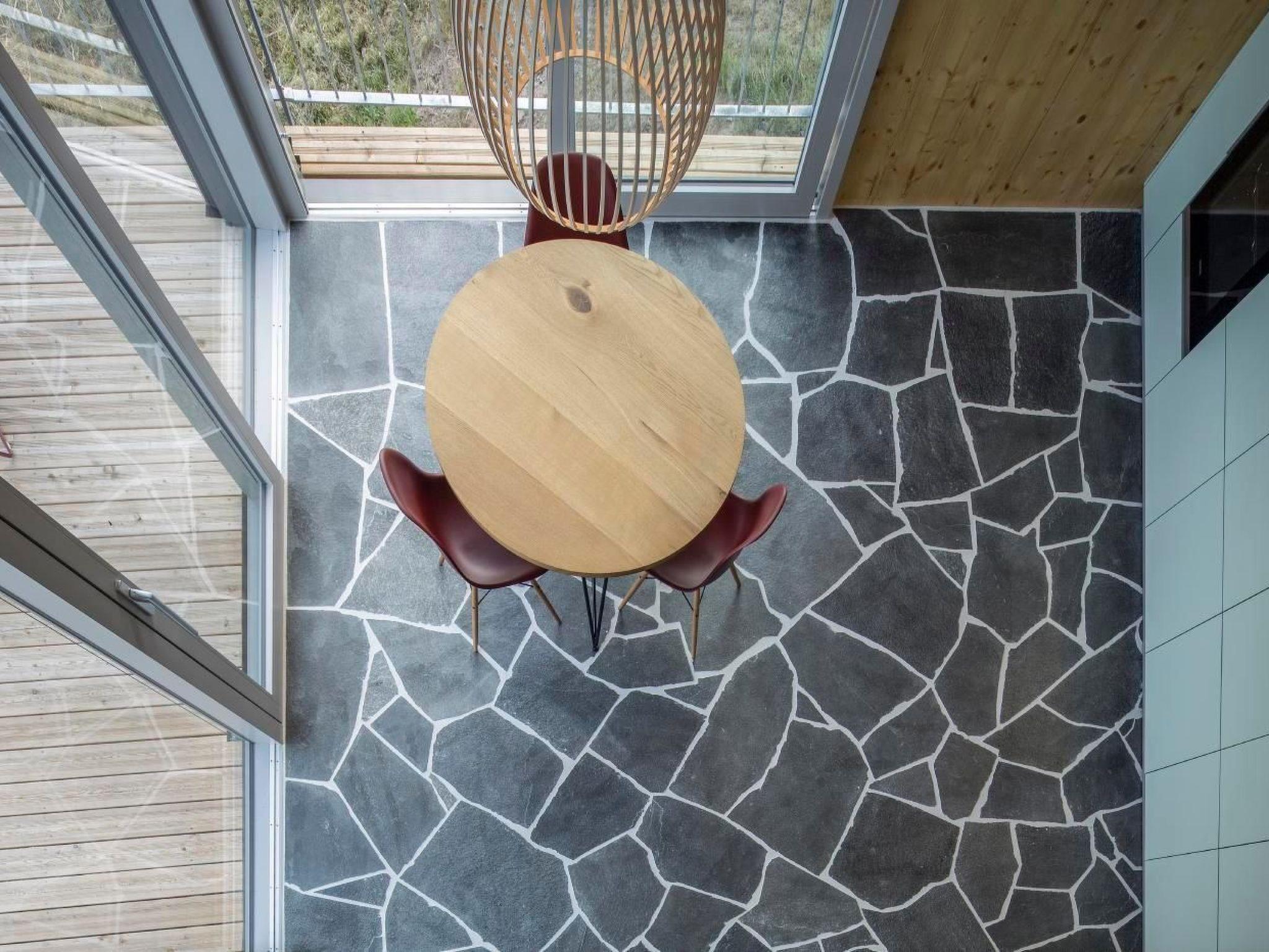 Inside, the archaic materialisation continues in a refined form: a continuous floor covering with polygonal slabs of split greenish shimmering quartzite runs through the continuum of all room areas. The white interior walls in the upper area are intimised at user level by warm wood panelling. A few select colour and material accents complete the picture.