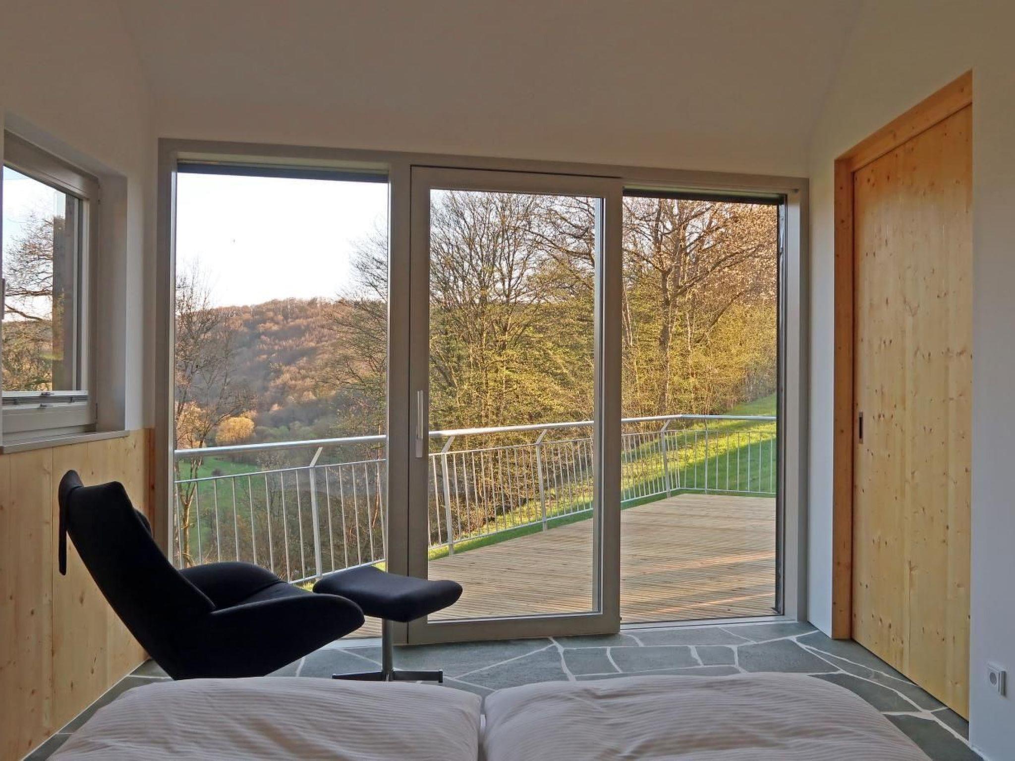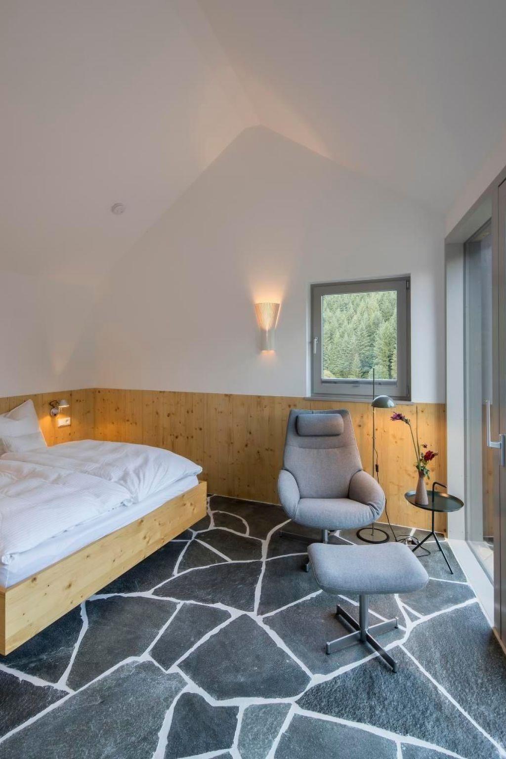 The sequence of rooms continues from the fireplace room into the sleeping area. There, the ceiling opens up again to below the lower roof. The bedroom is also connected to the terrace through the continuous ribbon window; from the bed you have a view of the valley. The sleeping area is part of the open-plan room sequence, but can also be partitioned off as a separate room using a sliding door. The corner fireplace acts as a buffer between the living area and the bedroom.