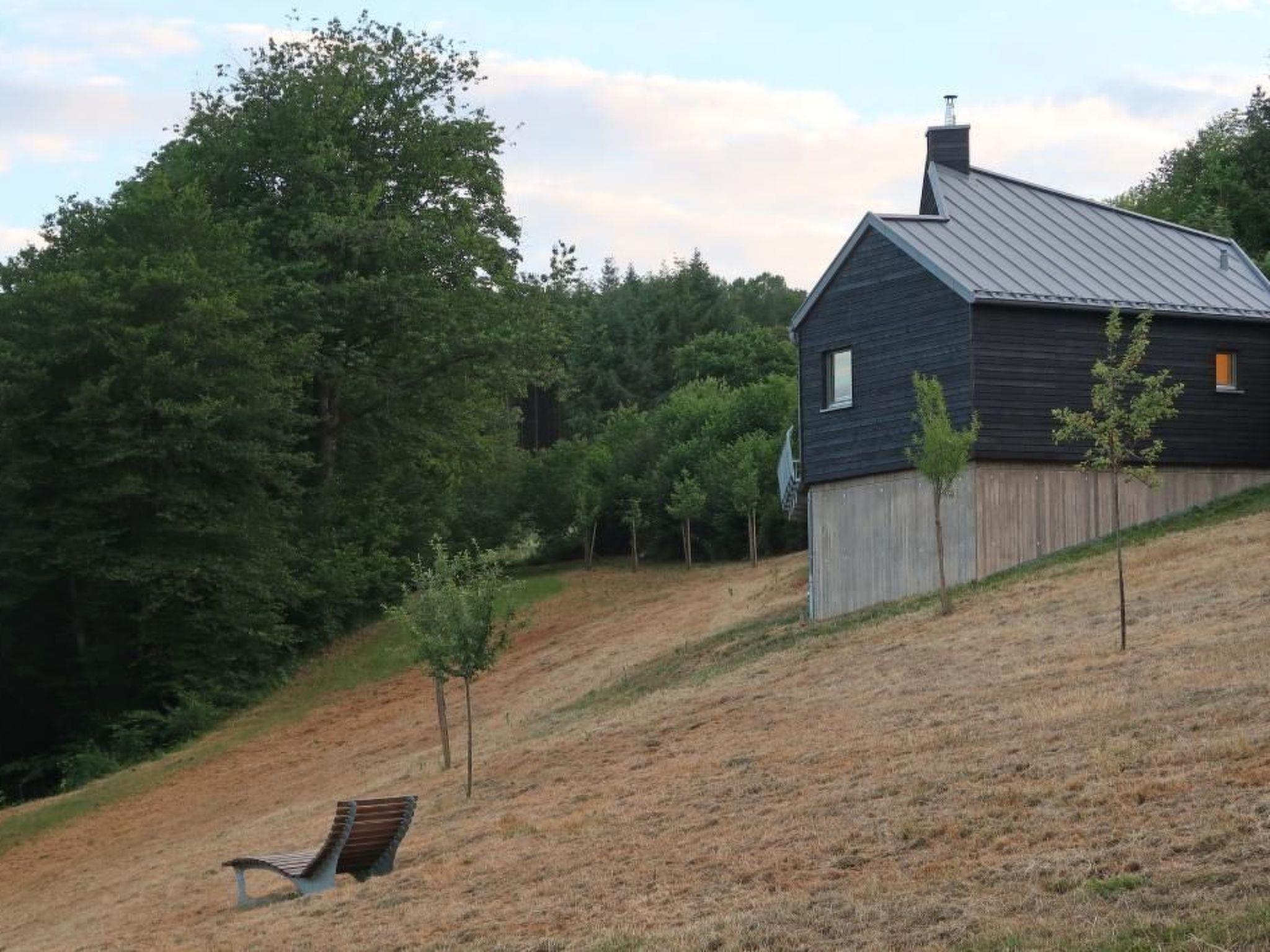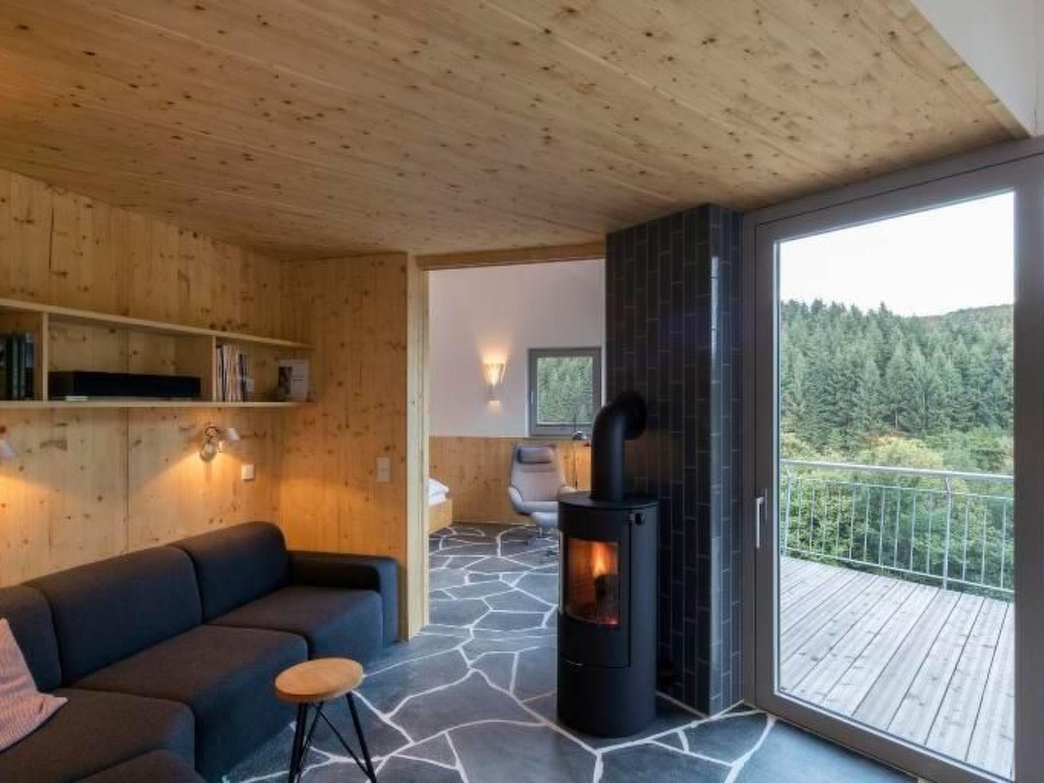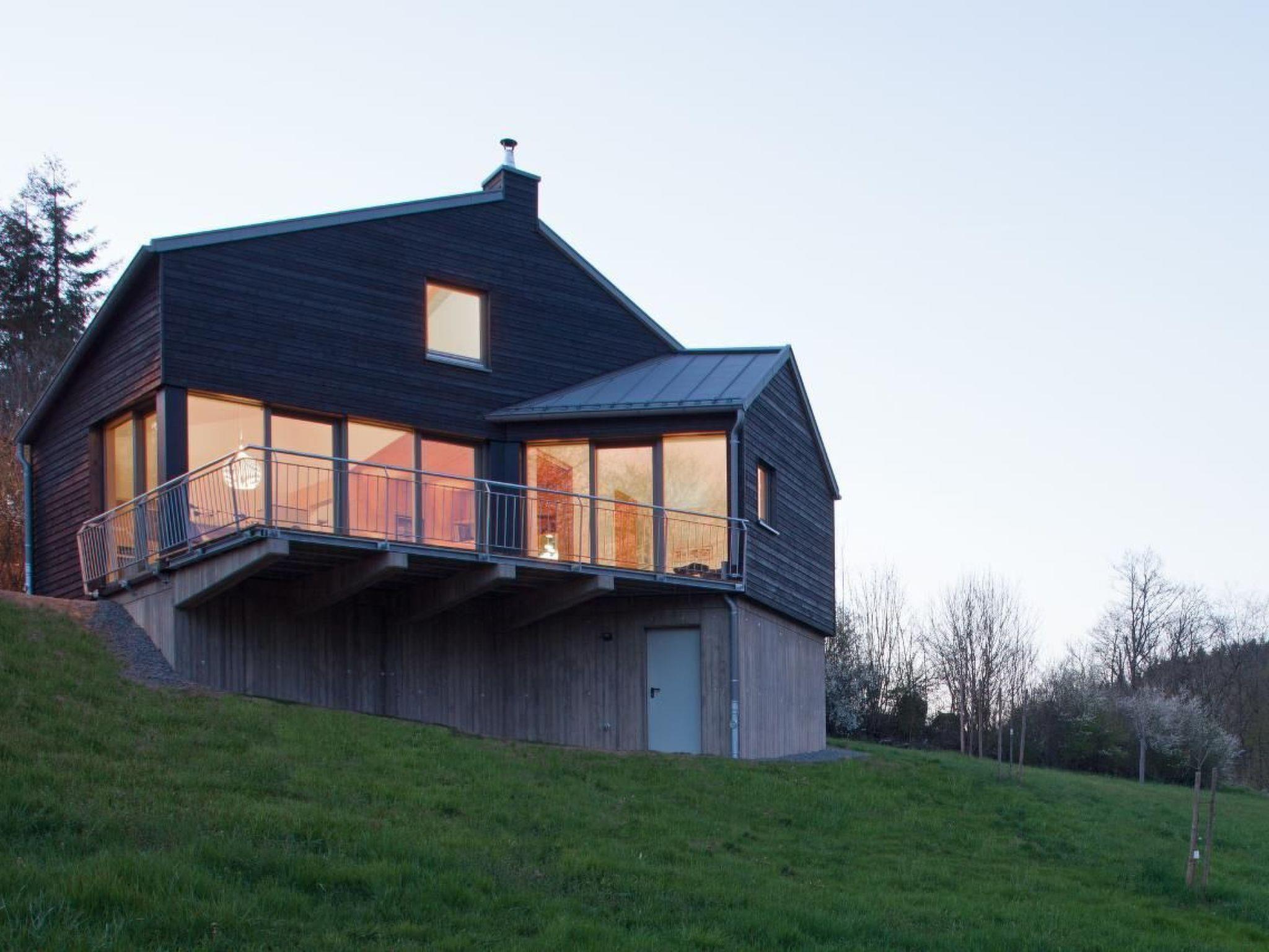 The wooden house on top is clad with raw wooden planks in inverted panelling. This wood is carbonised, i.e. the surface has been flamed until the top layer forms black charcoal - a rough and archaic treatment that stops the weathering process of the wood. As in a charcoal burner's hut, the chimney of the central fireplace forms the vertical end of the gable - it too is clad in black wood.