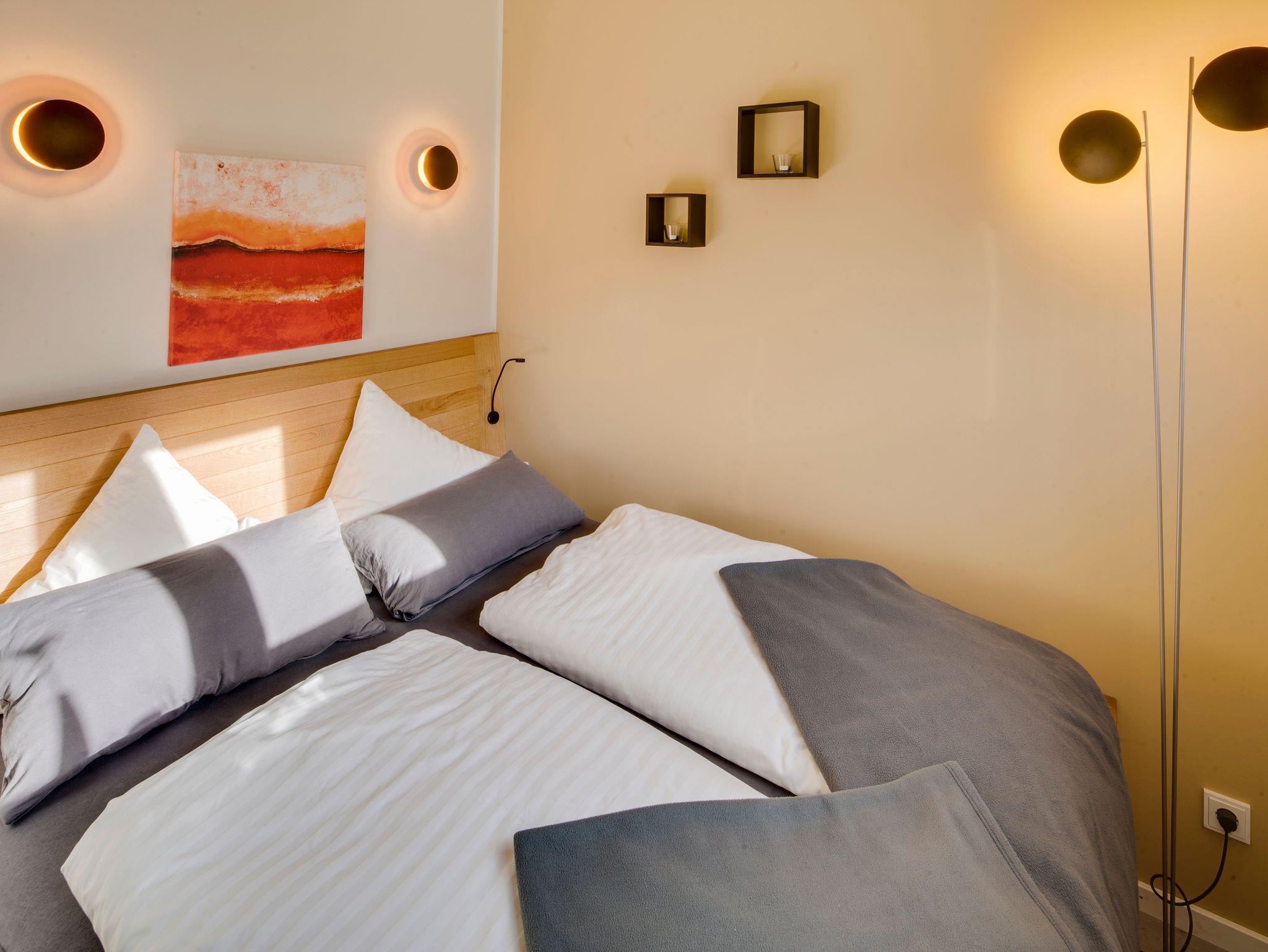 Das Magma wurde Ende 2016 erbaut und ist ein ca. 45 qm großes und trendiges Zweiraumwohnhaus mit überdachter Holzdielensonnenterrasse und edler Ausstattung. Das Haus liegt in absolut ruhiger Waldrandlage. Das Design vom Magma zeigt eine Reduktion auf das Wesentliche. Die Farbauswahl spiegelt sich in angenehmen Basalt- und Erdtönen. Doppelbett 1,60*2,00 Meter.