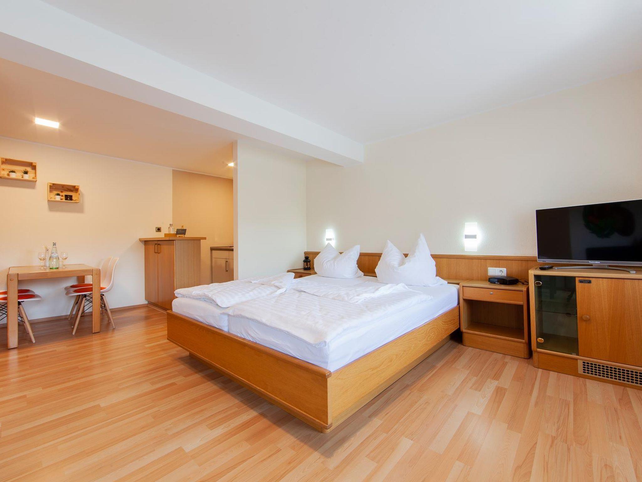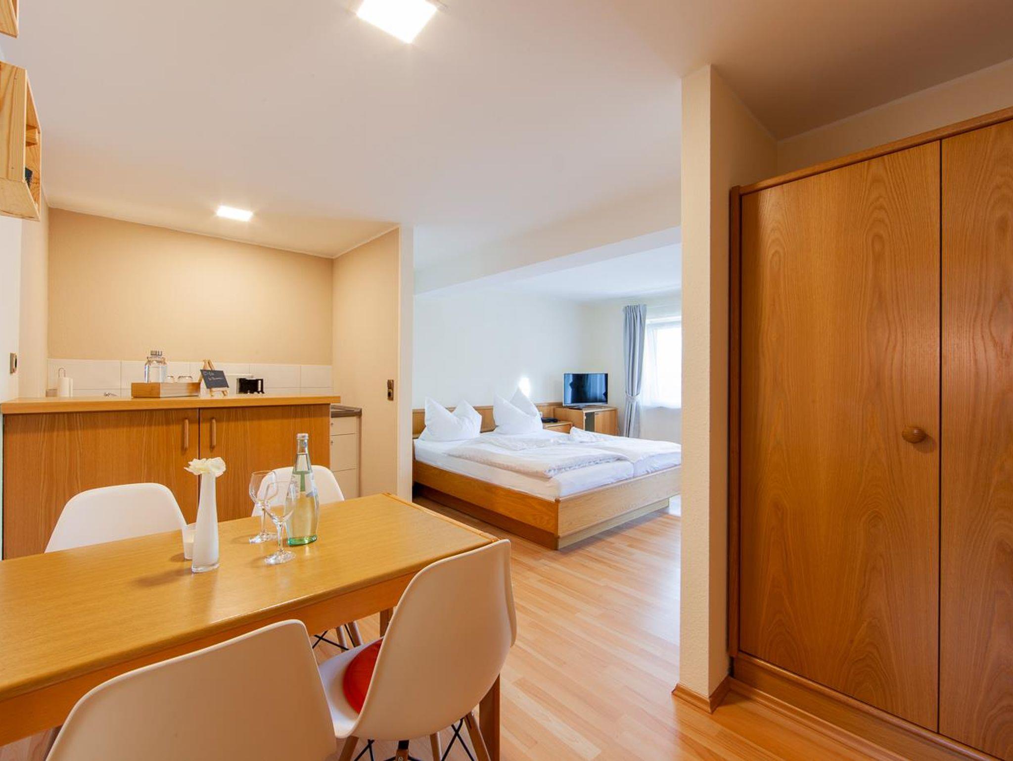 Unser Appartement Sonnenschein verfügt über einen großzügigen Schlaf-/Wohnbereich mit Flachbildfernseher, eine modern ausgestattete Küchenzeile, ein komfortables Badezimmer mit Dusche und WC inkl. Fön, sowie einen Balkon.