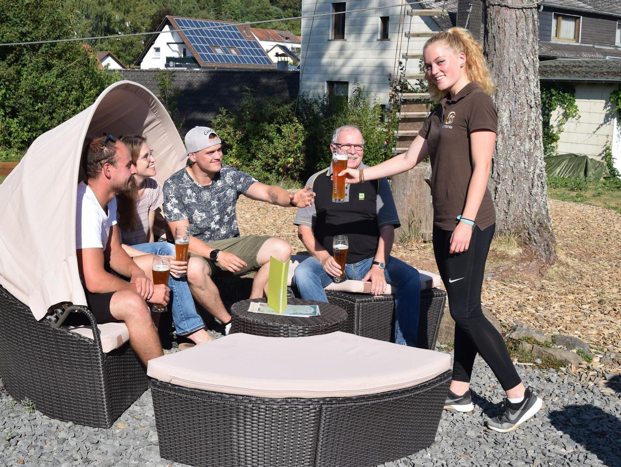 • Biergarten im angeschlossenen Ferien- und Freizeitpark EifelAdventures mit der Möglichkeit zum Eis schlemmen, selbstgebackenen Kuchen essen, Cocktail trinken oder Relaxen in der Hängematte