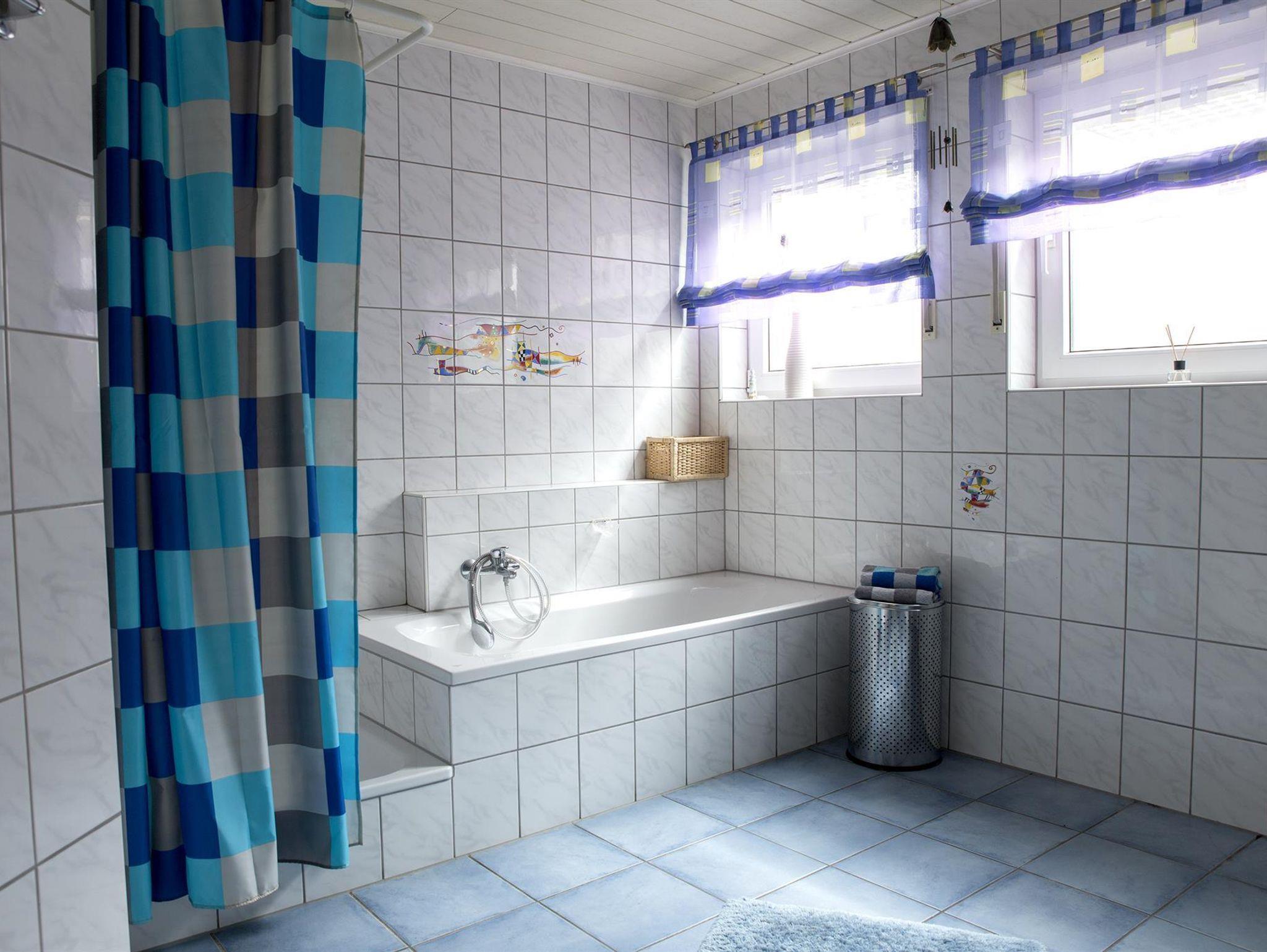 Das geräumige Bad verfügt über eine Badewanne mit WC, Dusche und Fön.