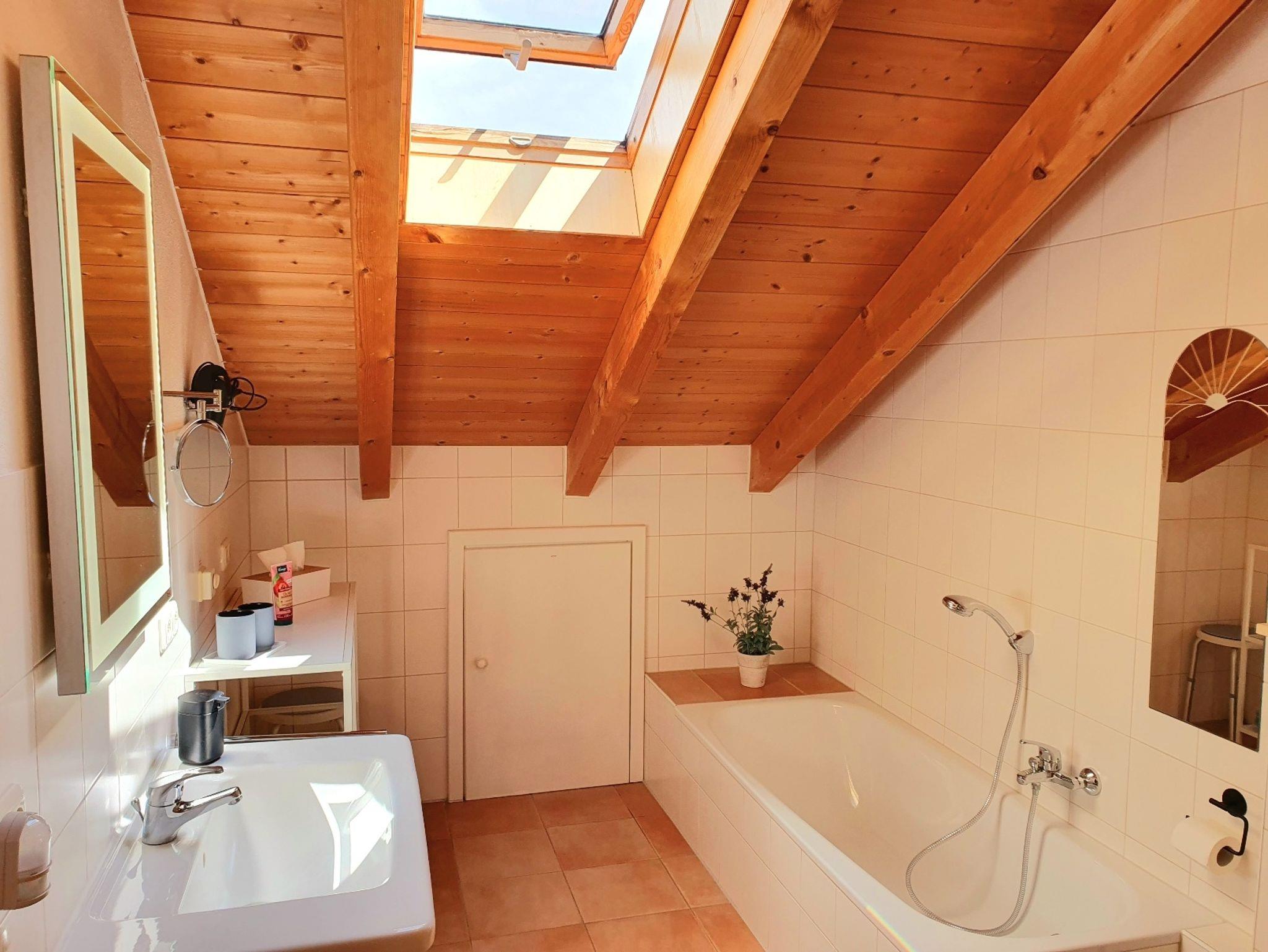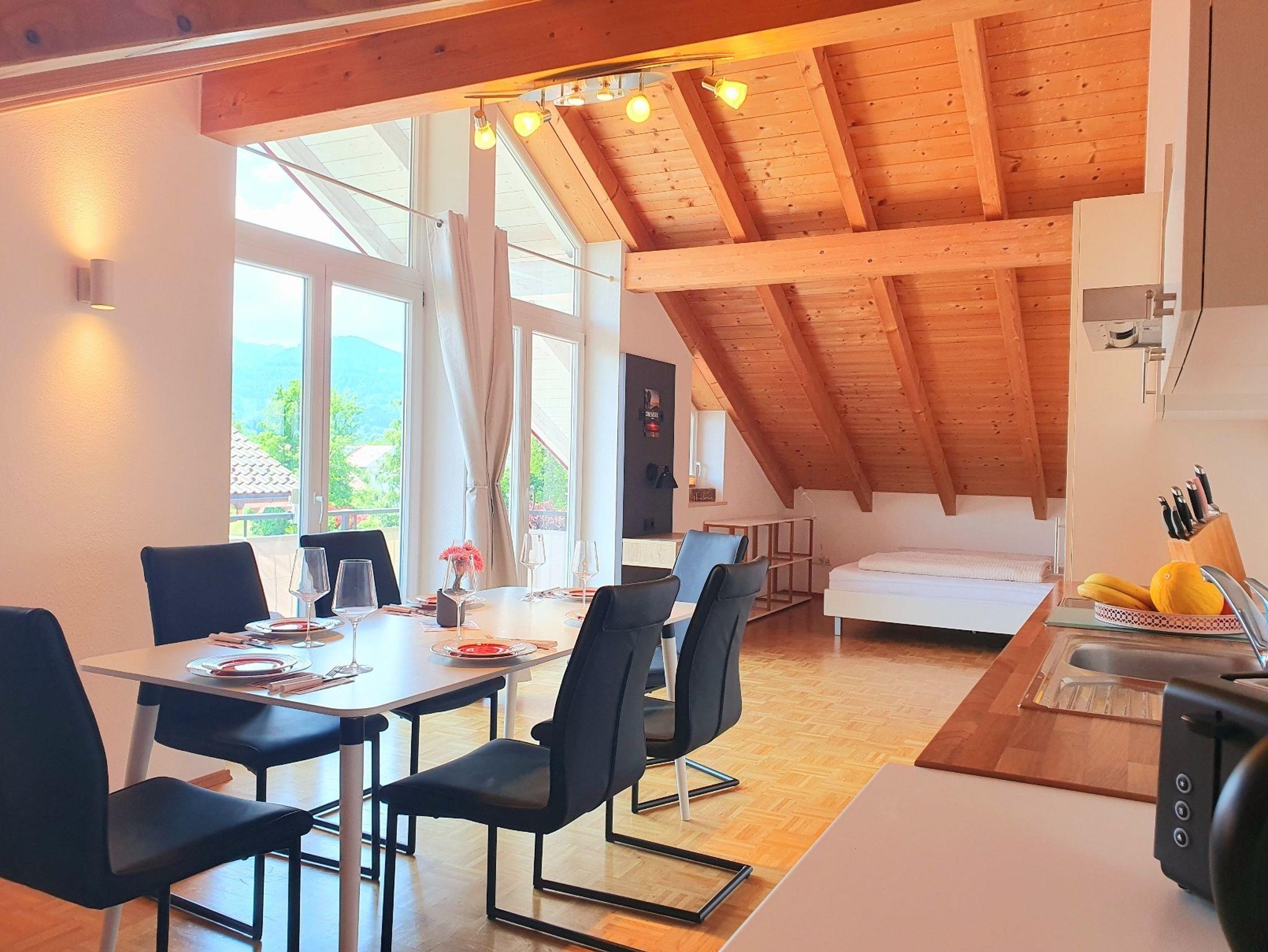 Ein echtes Highlight der Wohnung sind die sichtbaren Dachstuhlbalken, die großzügige Raumhöhe und die zwei Balkone. Auf dem Südbalkon können Sie auf einer Lounge-Liege für zwei Personen entspannen, während Sie auf dem Westbalkon die traumhafte Bergsicht und den Sonnenuntergang genießen. Ein Essplatz lädt zum Verweilen ein und macht die Wohnung perfekt für erholsame Tage.