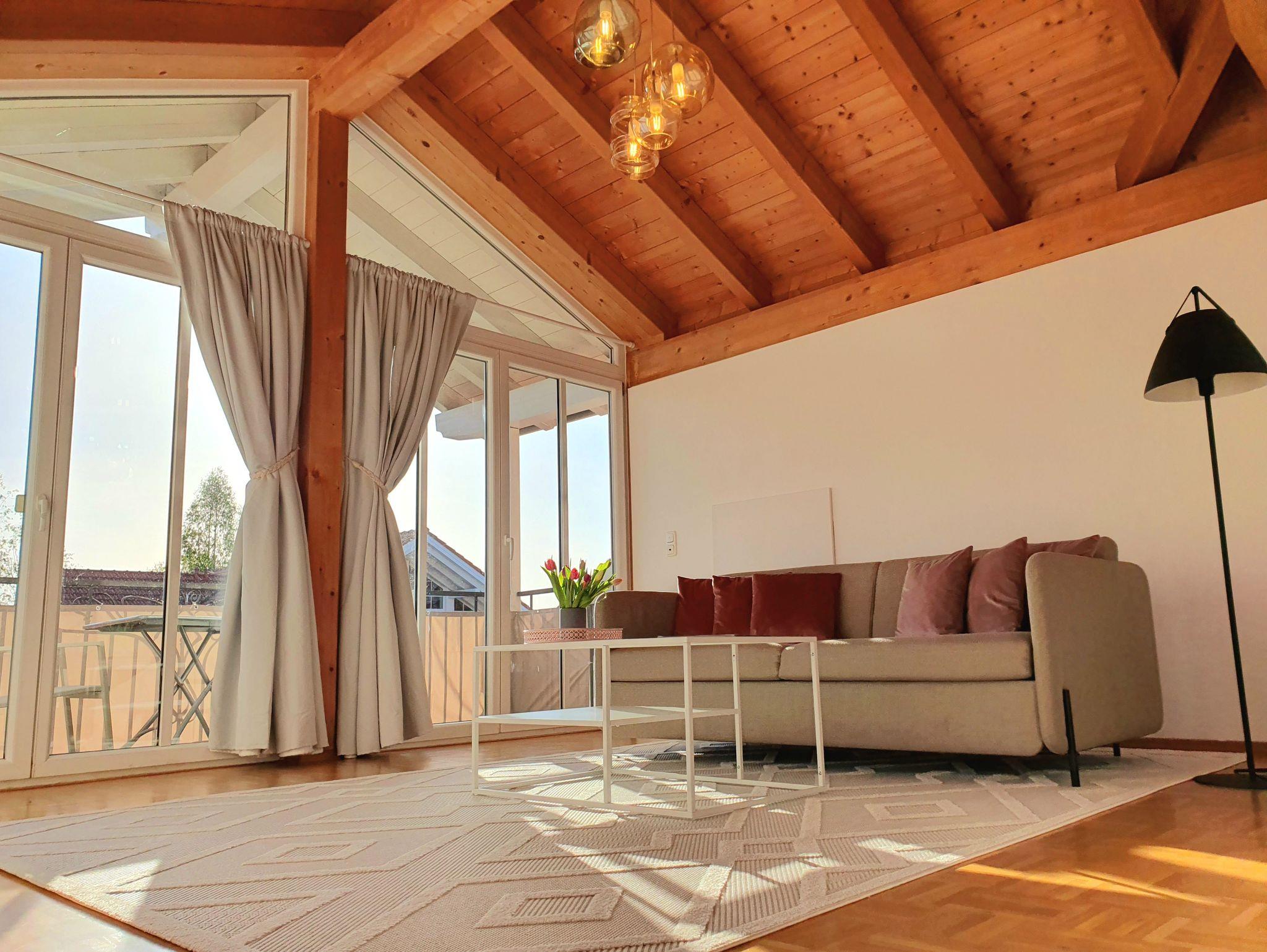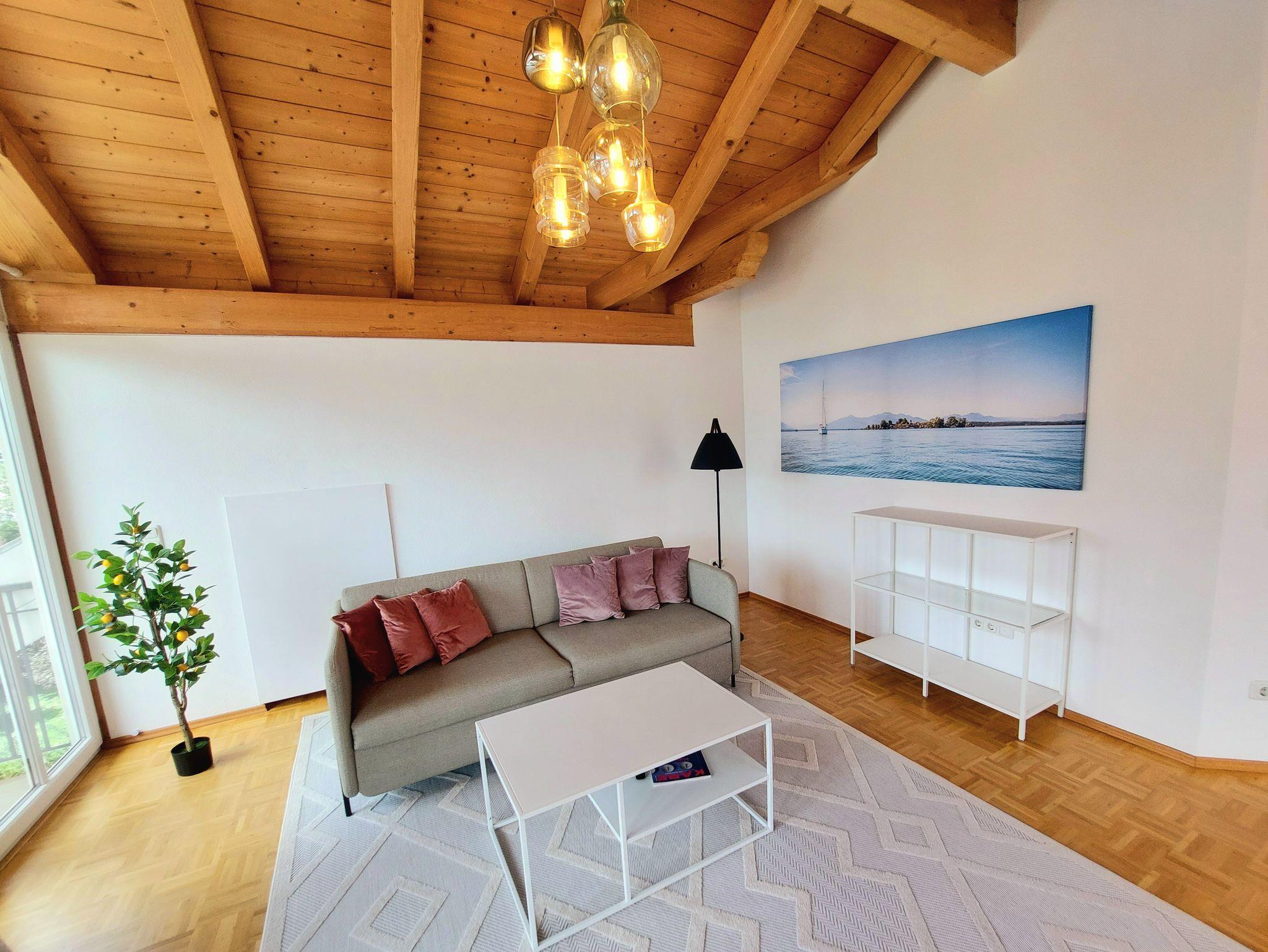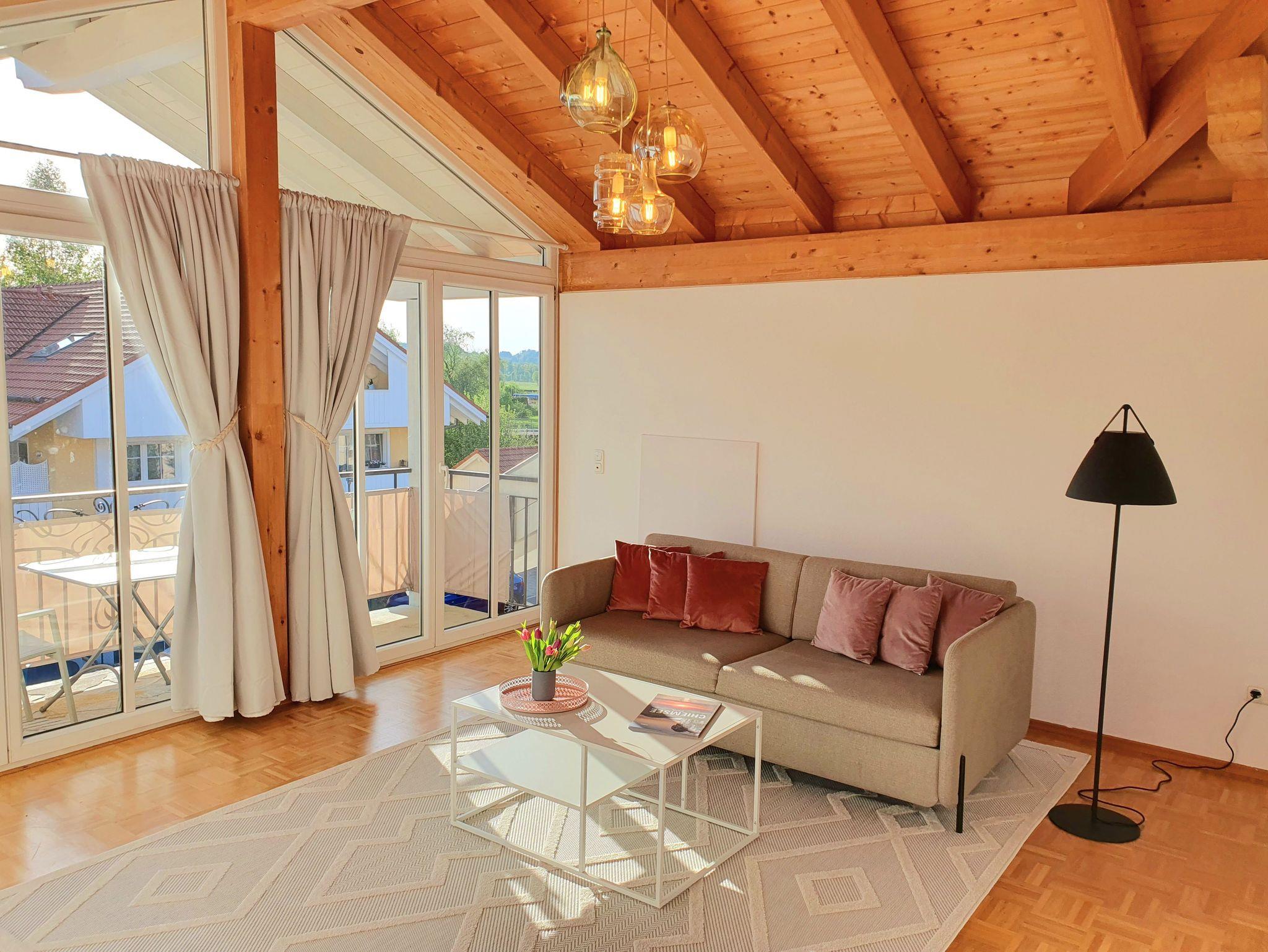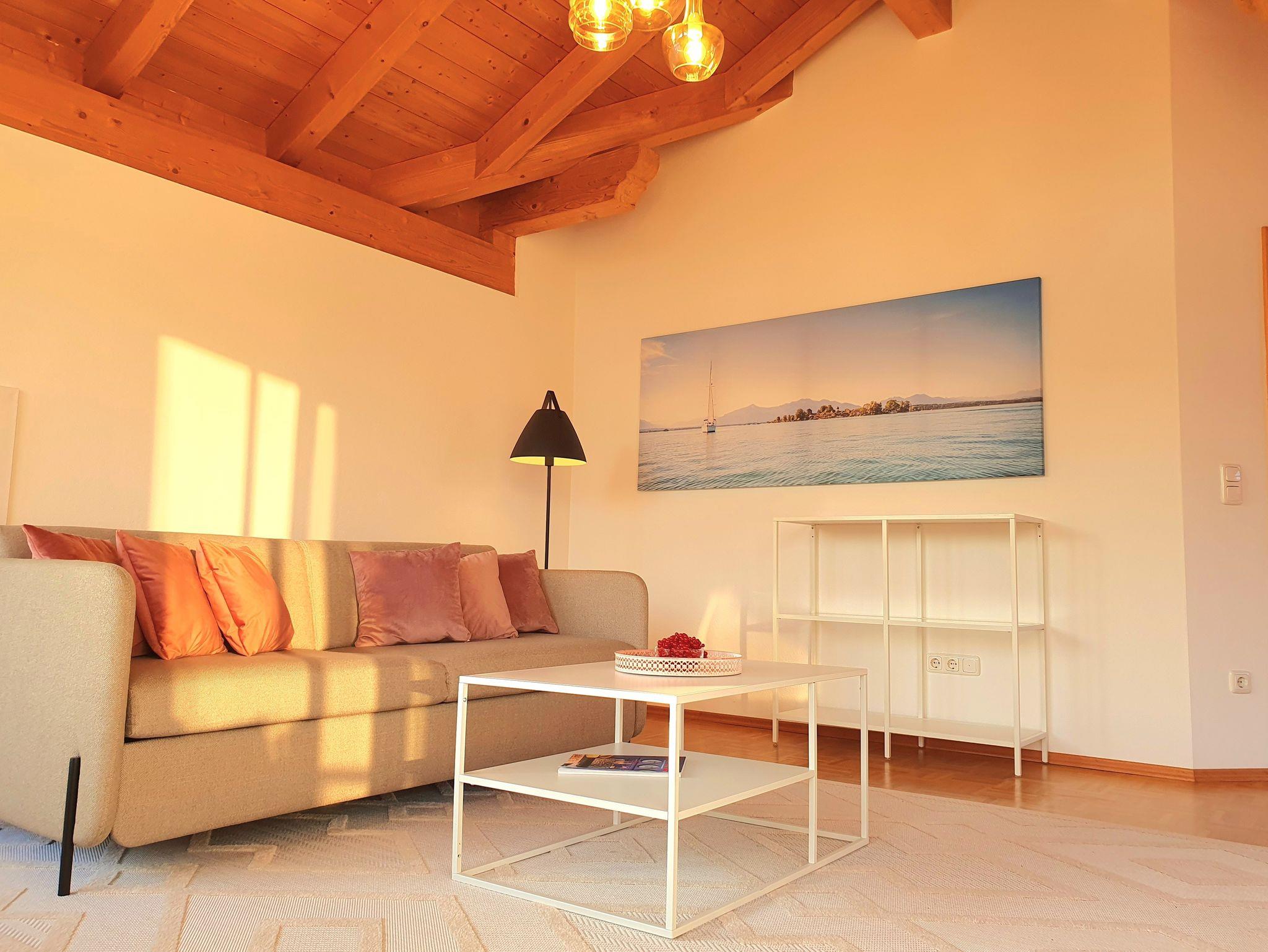 Modern und gemütlich: Die Ferienwohnung liegt zentral in einer ruhigen Seitenstraße und bietet im Dachgeschoss einen herrlichen Blick auf die beeindruckende Bergwelt (Kampenwand) rund um Bernau am Chiemsee. Stilvoll und modern eingerichtet bietet das Apartment alles, was für einen angenehmen Aufenthalt benötigt wird - für 1 bis 6 Personen (3 Doppelschlafplätze) inkl. 2 Parkplätzen.