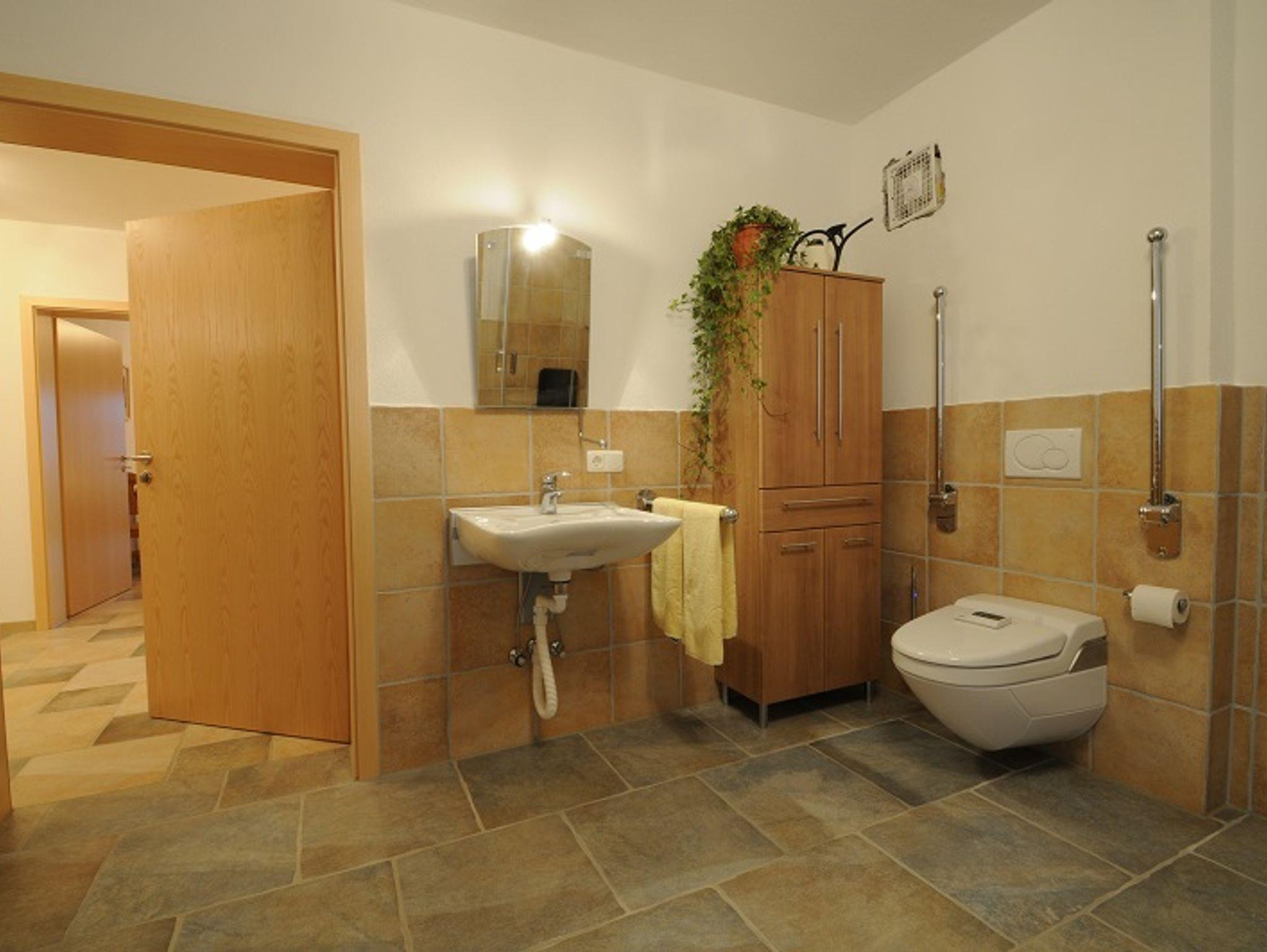 Helle, großzügige und barrierefreie Ferienwohnung in neuem Gästehaus. Der Eingang ist ebenerdig und die Türen mindestens 90 cm breit. Von der Wohnküche aus, die teilweise unterfahrbar und mit erhöhter Spülmaschine und Kühlschrank ist, erreichen Sie die Terasse. Die Terasse ist ebenfalls ohne Stufen. Schlafzimmer mit Fenster bis zum Boden und einem Wendekreis von min. 150 cm. Eines der zwei vorhandenen Badezimmer ist barrierefrei: Badewanne, Waschbecken höhenverstellbar mit Haltegriffen, ebenerdige Dusche mit Klappstuhl. Semmelservice möglich. Direkt vor dem Haus befindet sich ein Parkplatz. In einem Schlafzimmer ist ein Doppelbett, im zweiten Schlafzimmer sind zwei Einzelbetten. Die Ferienwohnung hat zwei Bäder. Im kleineren Bad ist eine Dusche, ein WC und Waschbecken und ein Handtuchtrockner. Das barrierefreie Bad hat eine Badewanne, ein höhenverstellbares Waschbecken mit Kippspiegel und Haltegriffe neben dem Becken. Die ebenerdige Dusche hat eine Bewegungsfläche von mind. 1,50 m. Die Duschwände können nach aussen oder innen geklappt werden. In der Dusche befindet sich ein Klappstuhl und Haltegriffe. Das Dusch-WC hat eine Fönfunktion und die Temperatur des Wassers kann man auch regeln. Neben dem WC sind Haltegriffe, die man auch nach oben klappen kann. Auch der Aufenthaltsraum und die Terasse sind rollstuhlgerecht. Gerne bringe ich Semmeln auf Wunsch, entsorge Ihren Müll und bringe Ihre Wäsche ins UG zum Waschen. - Sofern Sie das wünschen.