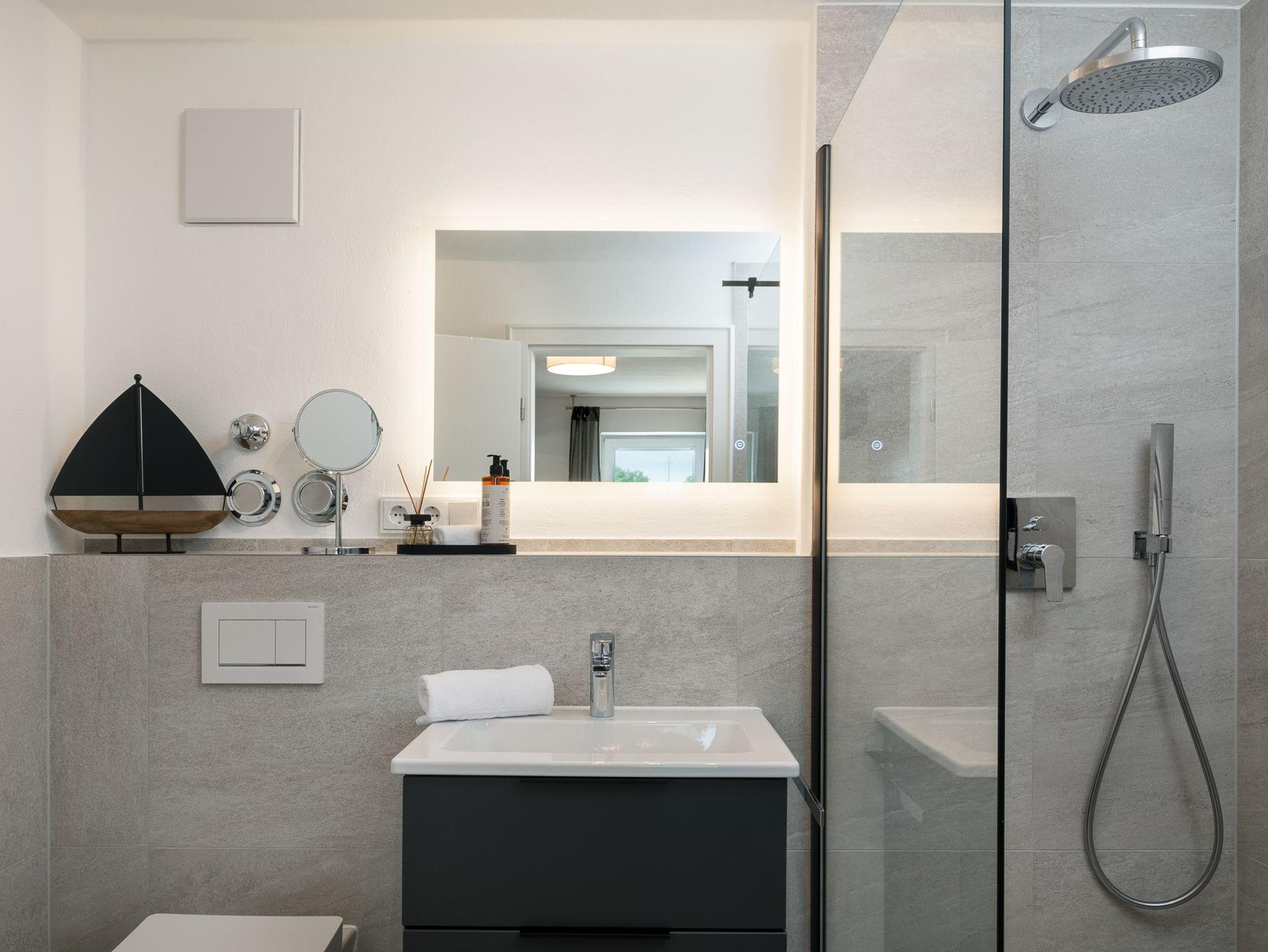 Genieße nach einem erlebnisreichen Tag pure Erfrischung in der hochwertigen, begehbaren Dusche unseres stilvollen Badezimmers.