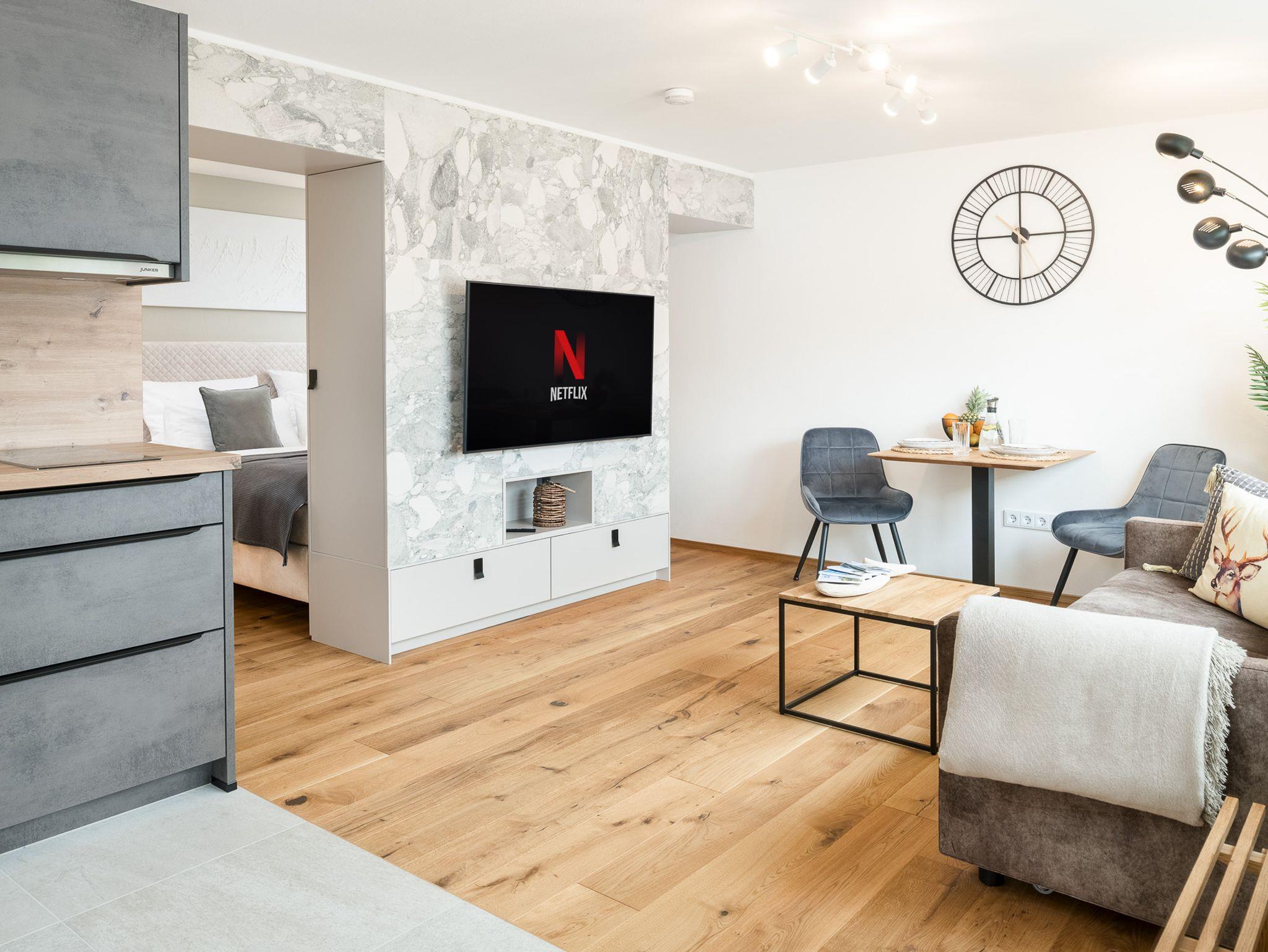 Entspann Dich im Wohnbereich mit gemütlichem Ambiente, das mit einem 55-Zoll-Smart-TV inkl. NETFLIX und Internet-TV in UHD-Qualität ausgestattet ist. Genieße Deine Lieblingssendungen und Filme in bester Bildqualität.
