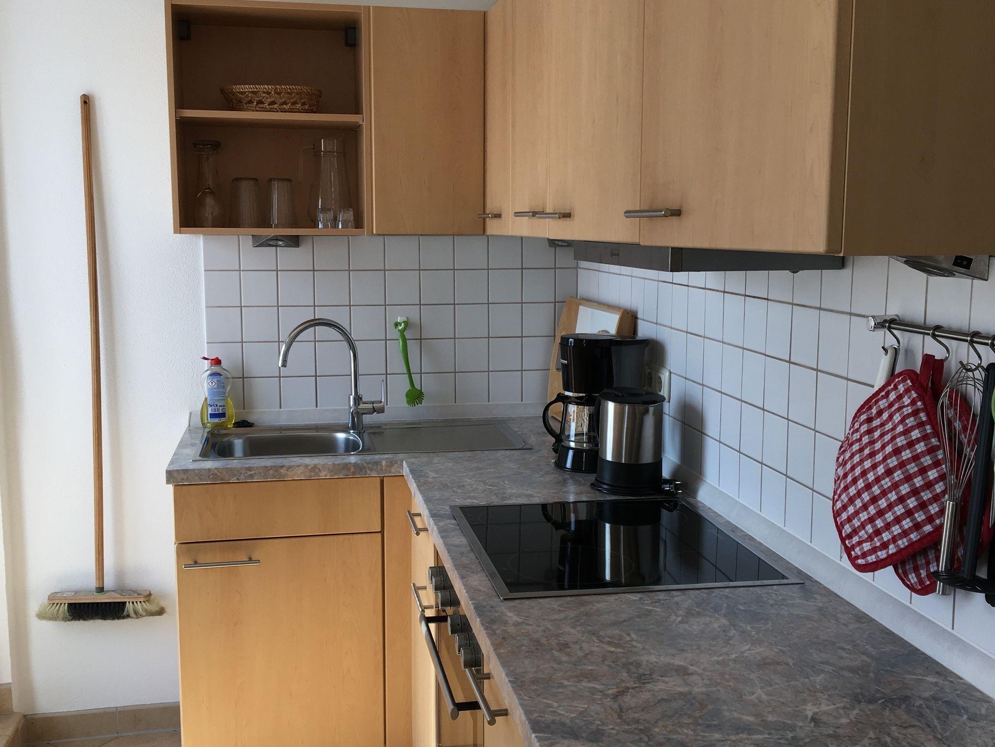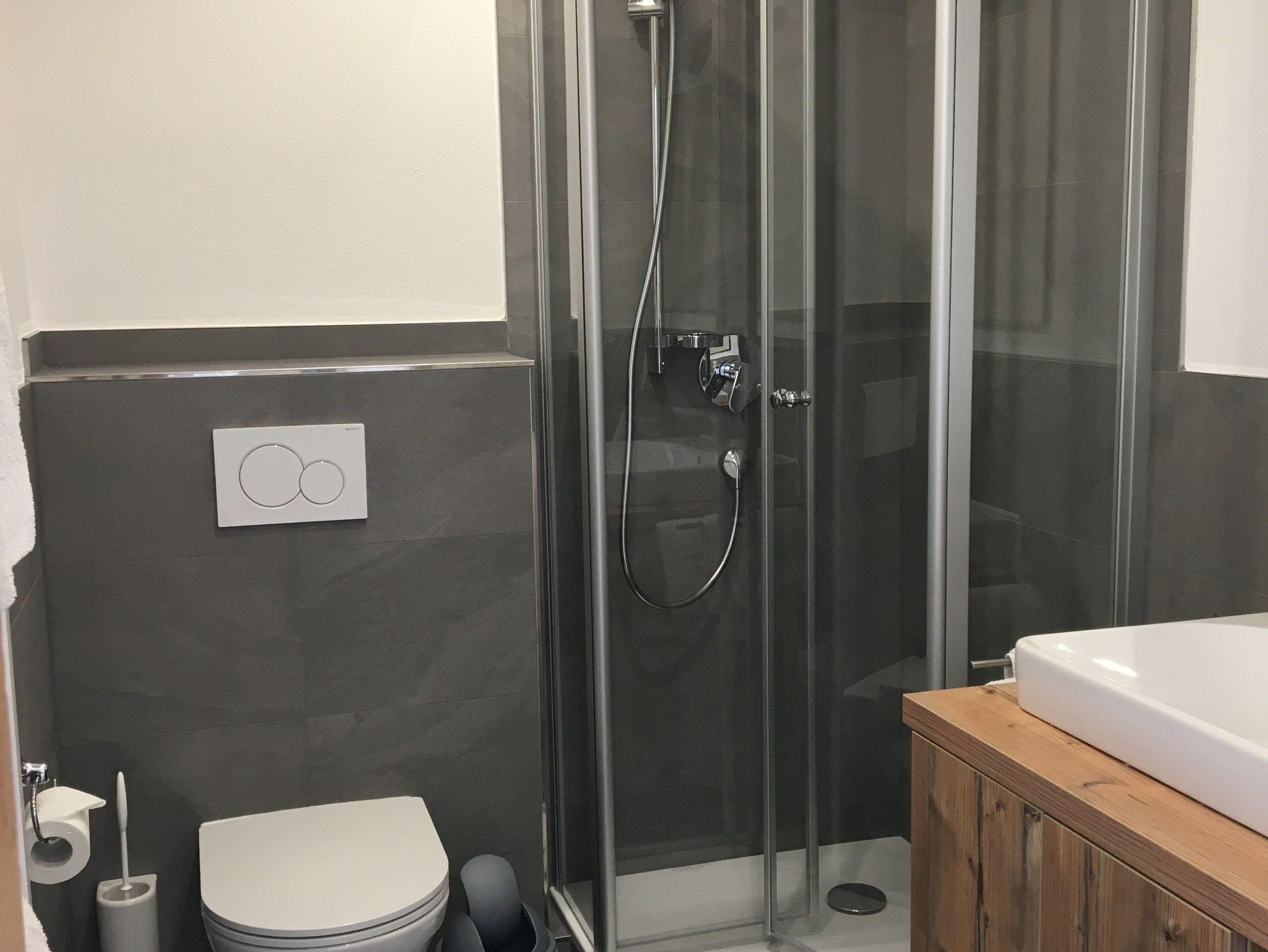 Eine kleine Ferienwohnung im Obergeschoss mit einer Dusche und einem WC. Kombinierter Wohn/- und Schlafraum. Von hier aus gibt es einen freien Blick auf die Berge.